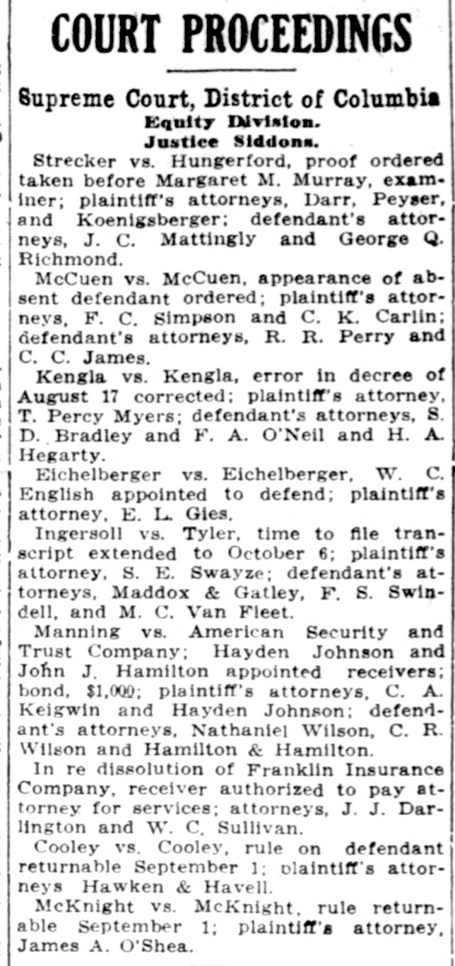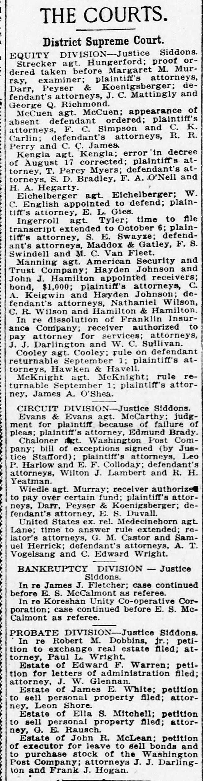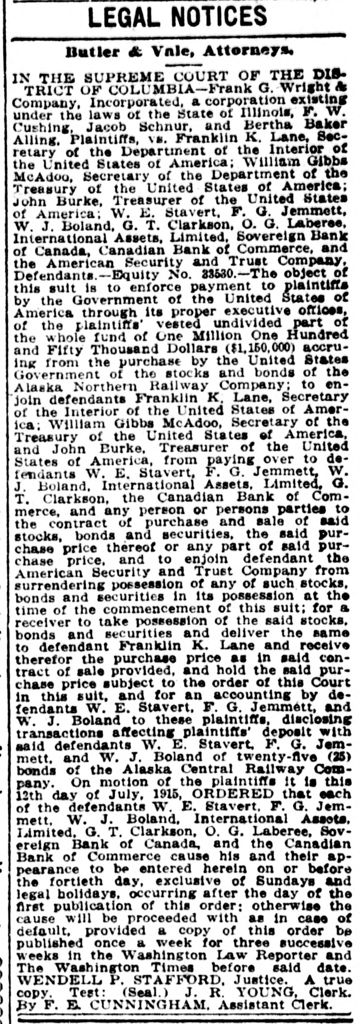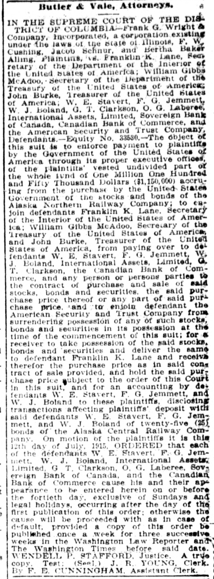 Butler & Vale, Attorneys. IN THE SUPREME COURT OF THE DISTRICT OF COLUMBIA-Frank G. Wright & Company, Incorporated, a corporation existing under the laws of the state of Illinois, F. W Cushing, Jacob Schnur, and Bertha Baker Alling. Plaintins, NA. Franklin K. Lane, Sech retary of the Department or the Interior of the United States of America; William Gibbs McAdoo, Secretary of the Department of the Treasury of the United States of America: John Burke, Treasurer of the United States of America; W. E. Stavert, F. G. Jemmett, W. J. Boland, G. T. Clarkson, O. G. Laberee, International Assets, Limited, Sovereign Bank of Canada, Canadian Bank of Commerce, and the American Security and Trust Company, Defendants.-Equity No. 33530.-The object of this suit is to enforce payment to plaintiffs by the Government of the United States of America through its proper executive offices, of the plaintiits' vested undivided part of the whole tund of One Million One Hundred and Fifty Thousand Dollars ($1,150,000) accruing from the purchase by the United States Government of the stocks and bonds of the Alaska Northern Railway Company; to ear join defendants Franklin K. Lane, Secretary of the Interior of the United States of America: William Gibbs McAdoo, Secretary of the Treasury of the United States of America, and John Burke, Treasurer of the United States of America, from paying over to deL fendants W. E. Stavert, F. G. Jemmett, W. J. Boland, International Assets, Limited, G. T. Clarkson, the Canadian Bank of Commerce, and any person or persons parties to the contract of purchase and sale of said stocks, bonds and securities. the said purchase price thereof or any part of said purchase price. sand to enjoin defendant the American Security and Trust Company from surrendering possession of any of such stocks, bonds and securities in its possession at the time of the commencement of this suit; for & receiver to take possession of the said stocks, bonds and securities and deliver the same to defendant Franklin K. Lane and receive therefor the purchase price as in said cons tract of sale provided. and hold the said purchase price jubject to the order of this Court in this suit, and for an accounting by defendants W. E. Stavert, F. G. Jemmett, and W. J. Boland to these plaintiffs, disclosing transactions affecting plaintiffs' deposit with said defendants W. E. Stavert, F. G. Jemmett, and W. J. Boland of twenty-five (25) bonds of the Alaska Central Railway Company. On motion of the plaintiffs it is this 12th day of July, 1915, ORDERED that each of the defendants W. E. Stavert, F. G. Jemmett. W. J. Boland, International Assets. Limited, G T. Clarkson, O, G. Laberee, Sovs ereign Bank of Canada, and the Canadian Bank of Commerce cause his and their ap+ pearance to be entered herein on or before the fortieth day. exclusive of Sundays and legal holidays, occurring after the day of the first publication of this order: otherwise the cause will be proceeded with as in case of default, provided a copy of this order be published once a week for three successive weeks in the Washington Law Reporter and The Washington Times before said date. WENDELL P. STAFFORD. Justice. A true copy. Test: (Seal) J. R. YOUNG, Clerk. By F. E. CUNNINGHAM. Assistant Clerk.