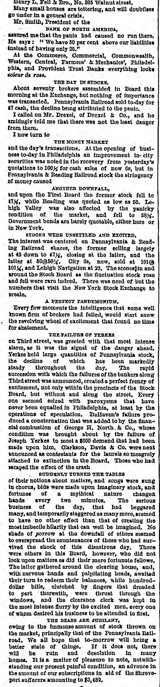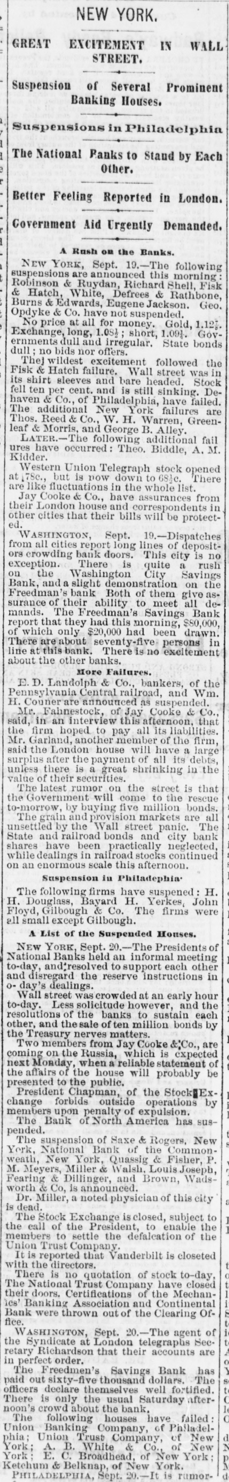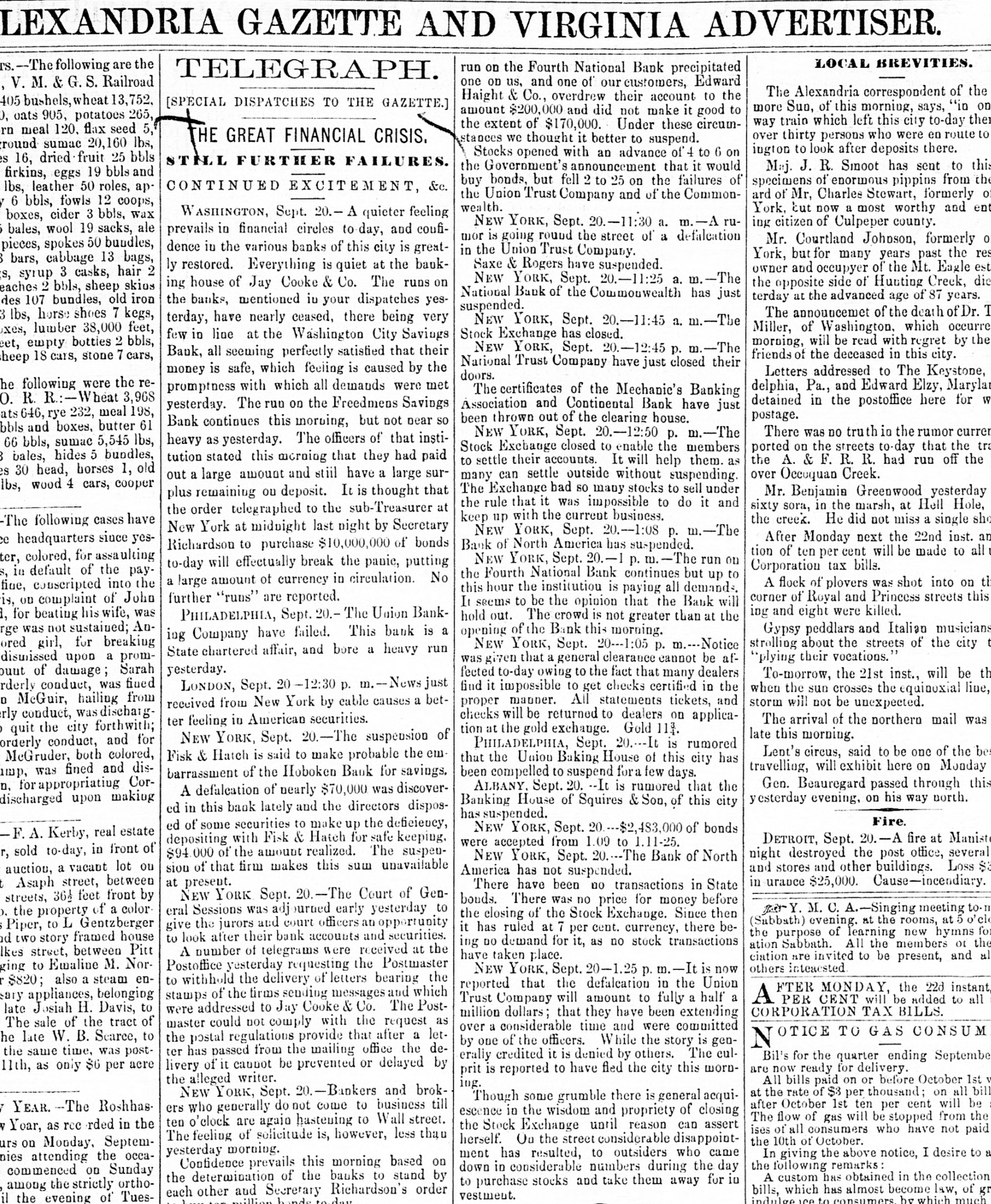 LEXANDRIA GAZETTE AND VIRGINIA ADVERTISER. LOCAL BREVITIES. TS. -The following are the run on the Fourth National Bank precipitated TELEGRAPH. one on us, and one of our customers, Edward , V. M. & G. S. Railroad The Alexandria correspondent of the Haight & Co., overdrew their account to the 405 bushels, wheat 13,752, [SPECIAL DISPATCHES TO THE GAZETTE.] more Suo, of this morning, says, "in on amount $200,000 and did not make it good to 0, oats 905, potatoes 265, way train which left this city to-day the the extent of $170,000. Under these circumrn meal 120, flax seed 5, over thirty persons who were en route to THE GREAT FINANCIAL CRISIS. stances we thought it better to suspend. round sumac 20,160 lbs, ington to look after deposits there. Stocks opened with an advance of 4 to 6 on s 16, dried fruit 25 bbls STINL FURTHER FAILURES. the Government's announcement that it would Maj. J. R. Smoot has sent to this firkins, eggs 19 bbls and buy bonds, but fell 2 to 25 on the failures of specimens of enormous pippins from the CONTINUED EXCITEMENT, &c. lbs, leather 50 roles, ap ard of Mr, Charlee Stewart, formerly of the Union Trust Company and of the Commony 6 bbls, fowls 12 coops, wealth. York, but now a most worthy and ent WASHINGTON, Sept. 20.- quieter feeling boxes, cider 3 bbls, wax NEW YORK, Sept. 20.-11:30 a. m.-A ruing citizen of Culpeper county. $ bales, wool 19 sacks, ale prevails in financial circles to day, and coufimor is going round the street of a defalcation Mr. Courtland Johnson, formerly 0 pieces, spokes 50 bundles, dence in the various banks of this city is greatin the Union Trust Company. York, but for many years past the res B bars, cabbage 13 bags, Saxe & Rogers have suspended. ly restored. Everything is quiet at the bankowner and occupyer of the Mt. Eagle est s, syrup 3 casks, hair 2 NEW YORK, Sept. 20.-11:25 a. .-The ing house of Jay Cooke & Co. The runs on the opposite side of Hunting Creek, die eaches 2 bbls, sheep skios National Bank of the Commonwealth has just terday at the advanced age of 87 years. des 107 bundles, old iron the banks, mentioned iu your dispatches yessuspended. The announcemet of the death of Dr. T 3 lbs, horse shoes 7 kegs, terday, have nearly ceased, there being very NEW YORK, Sept. 20.-11:45 a. m.-The Miller, of Washington, which occurre exes, lumber 38,000 feet, Stock Exchange has closed. few in line at the Washington City Savings morning, will be read with regret by the eet, empty botties 2 bbls, NEW YORK, Sept. 20.-12:45 p. m.-The Bauk, all seeming perfectly satisfied that their friends of the deceased in this city. sheep 18 cars, stone 7 cars, National Trust Company have just closed their money is safe, which feeling is caused by the Letters addressed to The Keystone, doors. he following were the redelphia, Pa., and Edward Elzy, Marylan promptness with which all demands were met The certificates of the Mechanic's Banking 0. R. R.:-Wheat 3,968 detained in the postoffice here for W Association and Continental Bank have just yesterday. The run on the Freedmens Savings ats 646, rye 232, meal 198, postage. been thrown out of the clearing house. Bank continues this morning, but not near so bbls and boxes, butter 61 There was no truth in the rumor currer NEW YORK, Sept. 20.-12:50 p. m.-The heavy as yesterday. The officers of that insti66 bbls, sumac 5,545 lbs, Stock Exchange closed to enable the members ported on the streets to-day that the tra 3 bales, hides 5 bundles, tution stated this morning that they had paid the A. & F. R. R. had run off the to settle their accounts. It will help them. as es 30 head, horses 1, old over Occuquan Creek. many can settle outside without suspending. out a large amount and stiil have a large surlbs, wood 4 cars, cooper The Exchange bad so many stocks to sell under Mr. Benjamin Greenwood yesterday plus remaining ou deposit. It is thought that the rule that it was impossible to do it and sixty sora, in the marsh, at Hell Hole, the order telegraphed to the sub-Treasurer at keep up with the current business. the creek. He did not miss a single she -The following cases have New York at midnight last night by Secretary NEW YORK, Sept. 20.--1:08 p. m.-The After Monday next the 22nd inst. an ce headquarters since yesRichardson to purchase $10,000,000 of bonds Bank of North America has suspended. tion of ten per cent will be made to all 1 ter, colored, for assaulting NEW YORK, Sept. 20.-1 p. run on to-day will effectually break the panic, putting Corporation tax bills. s, in default of the paythe Fourth National Bank continues but up to a large amount of currency in circulation. No A flock of plovers was shot into on th fine, conscripted into the this hour the institution is paying all demands. further "runs" are reported. corner of Royal and Princess streets this is, OD complaint of John It seems to be the opinion that the Bank will ing and eight were killed. 1, for beating his wife, was PHILADELPHIA, Sept. The Union Bankhold out. The crowd is not greater than at the rge was not sustained; AnGypsy peddlars and Italian musicians opening of the Bank this morning. ing Company have failed. This bank is a ored girl, for breaking strolling about the streets of the city t NEW YORK, Sept. 20---1:05 p. -Notice State chartered affair, and bore a heavy run dismissed upon a prom"plying their vocations." was given that a general clearance cannot be afyesterday. bunt of damage; Sarah feeted to-day owing to the fact that many dealers To-morrow, the 21st inst., will be th rderly conduct, was fined find it impossible to get checks certified in the LONDON, Sept. -12:30 p. m.--News just when the sun crosses the equinoxial line, D McGuir, hailing from proper manner. All statements tickets, and storm will not be unexpected. received from New York by cable causes a betrly conduct, was dischargchecks will be returned to dealers on applicaThe arrival of the northern mail was ter feeling in American securities. tion at the gold exchange. Gold 11 p qui