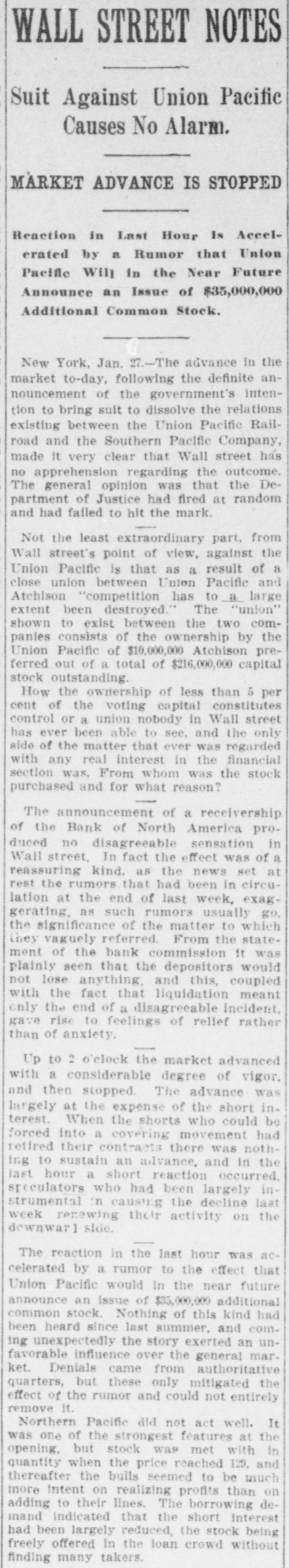 WALL STREET NOTES Suit Against Union Pacific Causes No Alarm. MARKET ADVANCE IS STOPPED Reaction in Last Hour Is Accelerated by a Rumor that Union Pacific Will in the Near Future Announce an Issue of $35,000,000 Additional Common Stock. New York, Jan. 27.-The advance in the market to-day, following the definite announcement of the government's intention to bring suit to dissolve the relations existing between the Union Pacific Railroad and the Southern Pacific Company, made it very clear that Wall street has no apprehension regarding the outcome. The general opinion was that the Department of Justice had fired at random and had failed to hit the mark. Not the least extraordinary part, from Wall street's point of view, against the Union Pacific is that as a result of a close union between Union Pacific and Atchison "competition has to a large extent been destroyed.` The "union" shown to exist between the two companies consists of the ownership by the Union Pacific of $10,000,000 Atchison preferred out of a total of $216,000,000 capital stock outstanding How the ownership of less than 5 per cent of the voting capital constitutes control or a union nobody in Wall street has ever been able to see, and the only side of the matter that ever was regarded with any real interest in the financial section was, From whom was the stock purchased and for what reason? The announcement of a receivership of the Bank of North America produced no disagreeable sensation in Wall street, In fact the effect was of a reassuring kind. as the news set at rest the rumors that had been in circulation at the end of last week, exaggerating, as such rumors usually go, the significance of the matter to which they vaguely referred. From the state. ment of the bank commission it was plainly seen that the depositors would not lose anything and this, coupled with the fact that liquidation meant only the end of a disagreeable incident gave rise to feelings of relief rather than of anxiety. Up to 2 o'clock the market advanced with a considerable degree of vigor, and then stopped The advance was largely at the expense of the short in. terest. When the shorts who could be forced into a covering movement had retired their contracts there was nothing to sustain an advance, and in the last hour a short reaction occurred speculators who had been largely instrumental in causurg the decline last week renewing their activity on the downwar] side. The reaction in the last hour was accelerated by a rumor to the effect that Union Pacific would in the near future announce an issue of $35,000,000 additional common stock. Nothing of this kind had been heard since last summer, and coming unexpectedly the story exerted an unfavorable influence over the general market. Denials came from authoritative quarters, but these only mitigated the effect of the rumor and could not entirely remove it. Northern Pacific did not act well. It was one of the strongest features at the opening, but stock was met with in quantity when the price reached 129. and thereafter the buils seemed to be much more intent on realizing profits than on adding to their lines. The borrowing demand indicated that the short interest had been largely reduced, the stock being freely offered in the loan crowd without finding many takers.