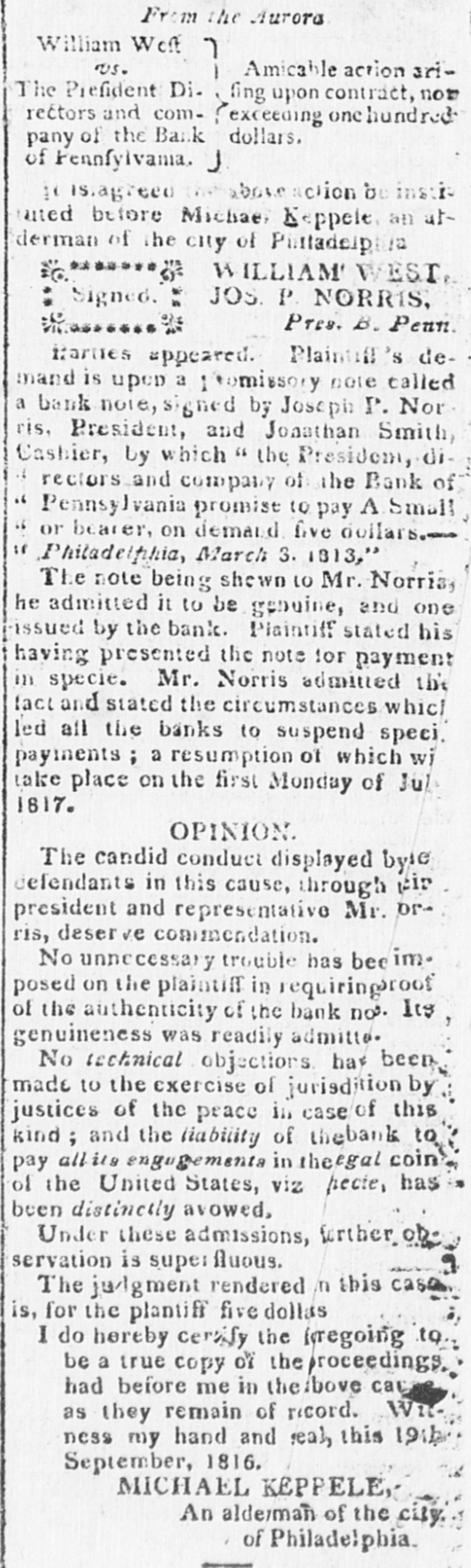 From the Aurora William Weft US. Amicable action ariThe Prefident Di. fing upon contract, nor rectors and comexceeding one hundred pany of the Bank dollars. of Pennfyivania. J 11 is.agreed abovenation be instit uted before Michae, Kappele an at derman of the city of 12 WILLIAM W EST Signed : JOS P. NORRIS, Pres. B. Penn. ********** Parties appeared. Plaintiff's demand is upon a Itemissory note called a bank note, signed by Joseph P. Nor ris, President, and Jonathan Smith, Cashier, by which " the President, di rectors and company of the Bank of Pennsylvania promist to pay A Small or bearer, on demand five dollars Philadelphia, March 3. 1813, The note being shewn to Mr. Norris, he admitted it to be genuine, and one issued by the bank. Plaintiff stated his having presented the note for payment in specie. Mr. Norris admitted the fact and stated the circumstances which led all the banks to suspend speci. payments ; a resumption of which wi take place on the first Monday of Jul 1817. OPINION The candid conduct displayed byte defendants in this cause, through gir president and representative Mr. DIris, deser ve commendation. No unnecessary trouble has becimposed on the plaintiff in requiringroof of the authenticity of the bank no. Its genuineness was readily admitte. No technical objections, has been made to the exercise of jurisdition by justices of the peace in case of this kind; and the liability of thebank to pay allits engagements in the gal coin of the United States, viz pecte, has been distinctly avowed, Under these admissions, further ob. servation is super fluous. The judgment rendered n this case is, for the plantiff five dollas I do hereby certify the fregoing to be a true copy of the proceedings, had before me in theibove cau as they remain of record. Wit ness my hand and real, this 19th September, 1816. MICHAEL KEPPELE, An alderman of the city. of Philadelphia.