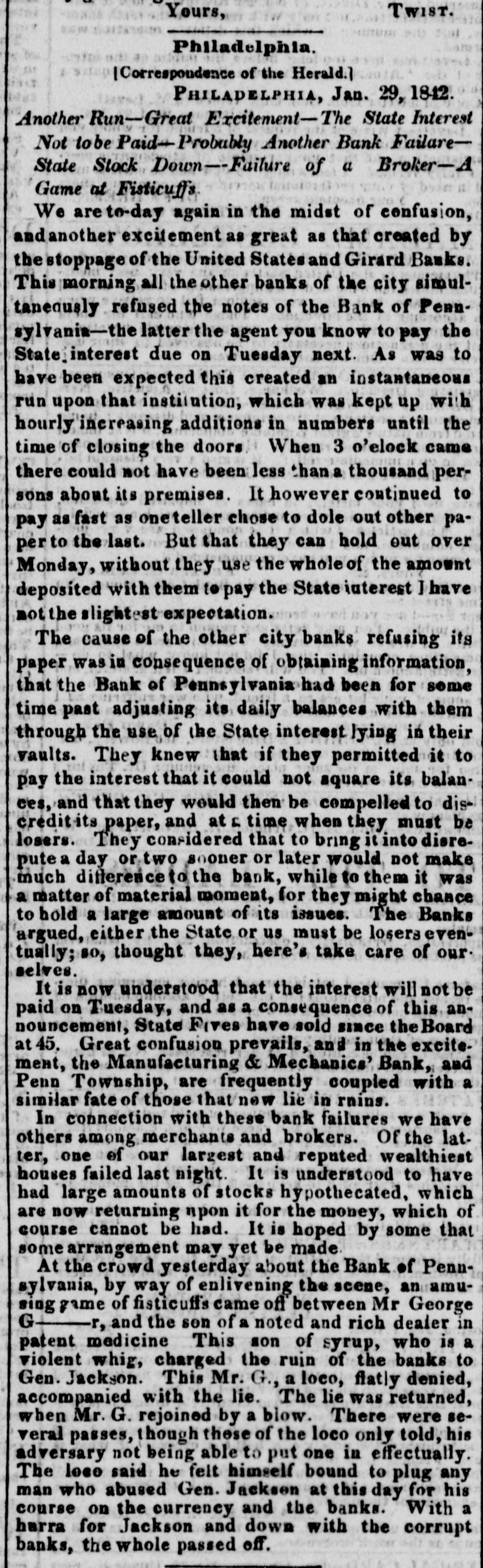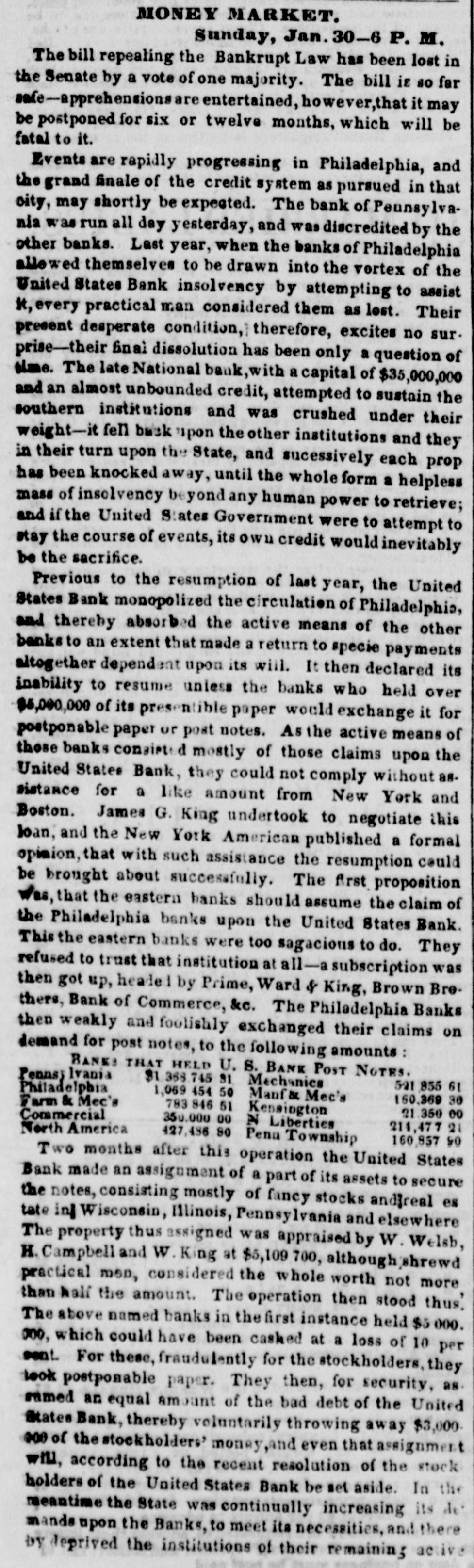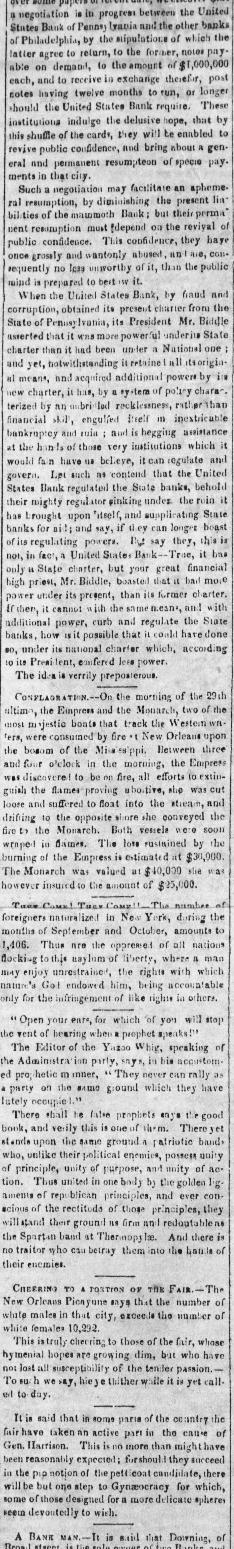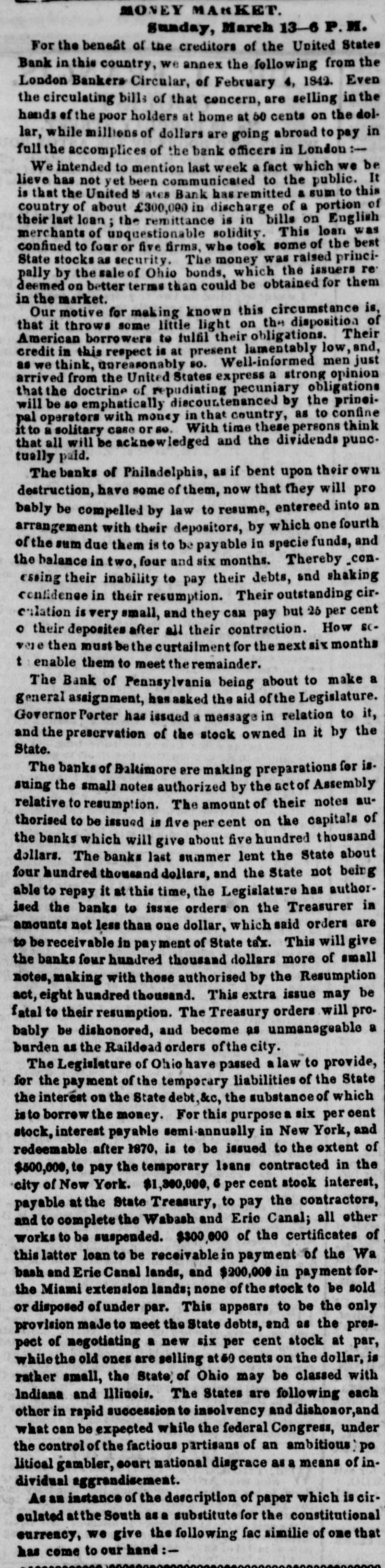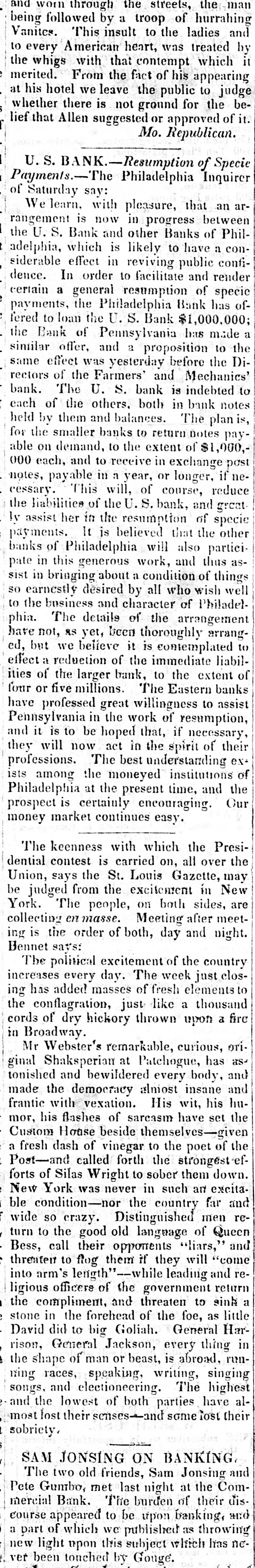 and worn through the streets, the man being followed by a troop of hurrahing Vanites. This insult to the ladies and to every American heart, was treated by it the whigs with that contempt which merited. From the fact of his appearing at his hotel we leave the public to judge whether there is not ground for the belief that Allen suggested or approved of it. Mo. Republican. BANK.-Resumption of Specie Payments.-The Philadelphia Inquirer of Saturday say: We learn. with pleasure, that an arrangement is now in progress between the U.S. Bank and other Banks of Philadelphia, which is likely to have a considerable effect in reviving public confidence. In order to facilitate and render certain a general resumption of specie the Philadelphia loan the U. S. Bank payments, fered to Bank $1,000,000; has ofof a the Bank Pennsylvania has made the similar offer, and a proposition to was yesterday the Farmers' and same rectors effect of before Mechanics' the Dibank. The U. S. bank is indebted to each of the others. both in bank notes held by them and balances. The plan is, smaller banks to return payto the extent for the on demand, of notes $1,000,and to receive in able 000 each, exchange if post in a year, or longer, neThis will, of course, notes, cessary. payable bank, and reduce great the liabilities of the U. S. ly assist her in the resumption of specie payments. It is believed that the other of Philadelphia will also particiin this generous work, in about a sist pate banks bringing condition and of thus things well asearnestly desired by all who wish to so and character of PhiladelThe details of the have not, as yet, been phia. the business thoroughly arrangement arranged, but we believe it is contemplated to effect a reduction of the immediate liabilof the larger bank, to the extent of millions. The Eastern great to ities four have or professed five willingness resumption, banks assist Pennsylvania in the work of it is to be hoped that, if necessary, will now act in the spirit The best ex- of and they professions. understanding institutions of their ists among the moneyed the Philadelphia at the present time, and Cur prospect is certainly encouraging. money market continues easy. The keenness with which the Presi- the dential contest is carried on, all over Union, says the St. Louis Gazette, New may be judged from the excitement in are York. The people, on both sides, collecting en masse. Meeting after meetBennet says: ing is the order of both, day and night. The political excitement of the country closincreases every day. The week just to has added masses of fresh elements thousand ing conflagration, just like a fire the cords of dry hickory thrown upon a in Broadway. Mr Webster's remarkable, curious, has oriShaksperian at Patchogue, and asionished ginal and bewildered every body, and the democracy almost insane his hufrantic made with vexation. His wit, set the his flashes of sarcasm have mor, Custom House beside themselves-given of the fresh dash of vinegar to the poet a Post-and called forth the strongest'e down. of Silas Wright to sober them excitaYork was never in an the country rewide so ble forts New condition-nor such far and crazy. Distinguished of men Queen the good old language and turn to call their opponents "come Bess, flog them if they will and threaten arm's to length"--while leading return reinto officers of the government sink a and threaten to as the the forehead of the foe, ligious compliment, in General Har- little in stone David did to big Goliah. thing ( General Jackson, every abroad, runrison, of man or beast, is singing the shape races, speaking writing, highest ring and electioneering. The have alsongs, lowest of both parties lost their most and the lost their senses-and some sobriety. JONSING ON BANKING SAM two old friends, Sam Jonsing Com- and The Gumbo, met last night at the their disPete Bank. The burden of and mercial appeared to be upon banking, throwing course of which we published as has nea part light upon this subject which new ver been touched by Gouge.
