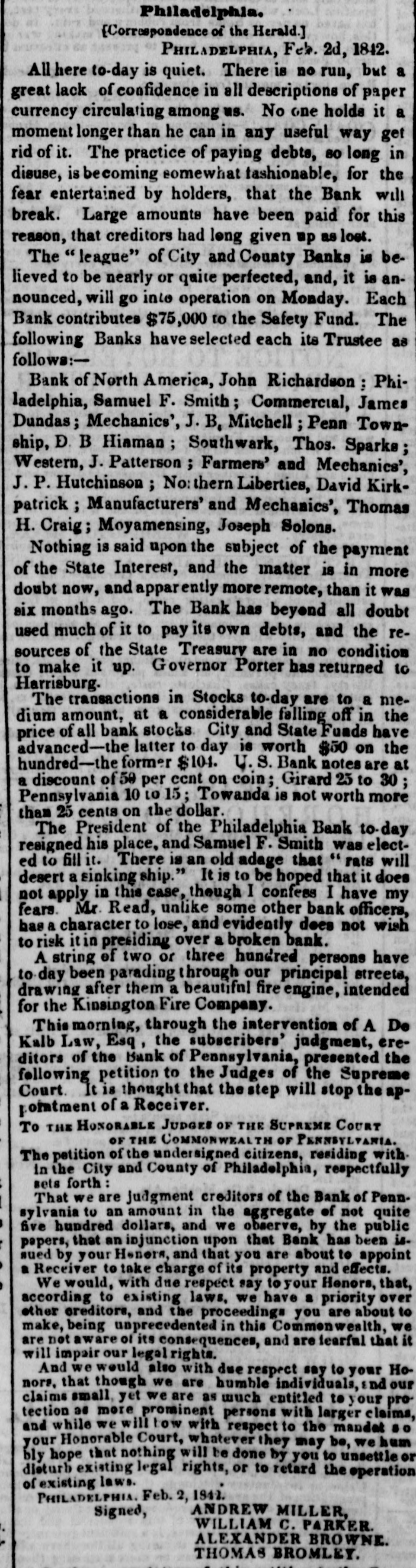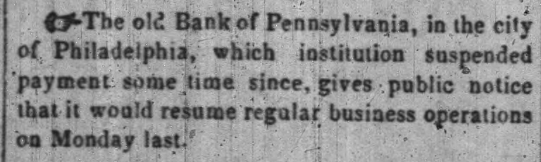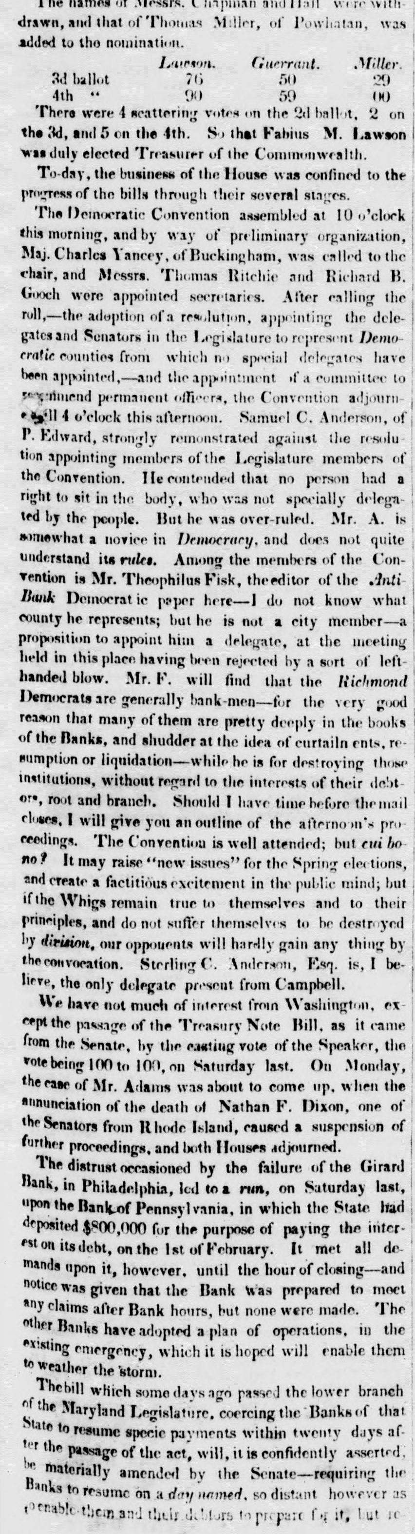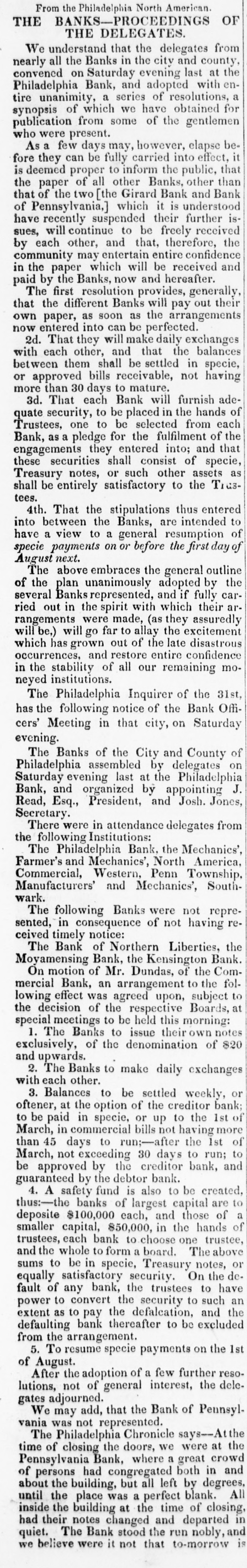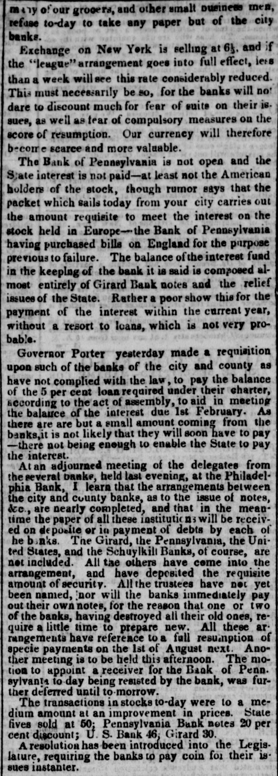 and worn through the streets, the man being followed by a troop of hurrahing Vanites. This insult to the ladies and to every American heart, was treated by it the whigs with that contempt which merited. From the fact of his appearing at his hotel we leave the public to judge whether there is not ground for the belief that Allen suggested or approved of it. Mo. Republican. BANK.-Resumption of Specie Payments.-The Philadelphia Inquirer of Saturday say: We learn. with pleasure, that an arrangement is now in progress between the U.S. Bank and other Banks of Philadelphia, which is likely to have a considerable effect in reviving public confidence. In order to facilitate and render certain a general resumption of specie the Philadelphia loan the U. S. Bank payments, fered to Bank $1,000,000; has ofof a the Bank Pennsylvania has made the similar offer, and a proposition to was yesterday the Farmers' and same rectors effect of before Mechanics' the Dibank. The U. S. bank is indebted to each of the others. both in bank notes held by them and balances. The plan is, smaller banks to return payto the extent for the on demand, of notes $1,000,and to receive in able 000 each, exchange if post in a year, or longer, neThis will, of course, notes, cessary. payable bank, and reduce great the liabilities of the U. S. ly assist her in the resumption of specie payments. It is believed that the other of Philadelphia will also particiin this generous work, in about a sist pate banks bringing condition and of thus things well asearnestly desired by all who wish to so and character of PhiladelThe details of the have not, as yet, been phia. the business thoroughly arrangement arranged, but we believe it is contemplated to effect a reduction of the immediate liabilof the larger bank, to the extent of millions. The Eastern great to ities four have or professed five willingness resumption, banks assist Pennsylvania in the work of it is to be hoped that, if necessary, will now act in the spirit The best ex- of and they professions. understanding institutions of their ists among the moneyed the Philadelphia at the present time, and Cur prospect is certainly encouraging. money market continues easy. The keenness with which the Presi- the dential contest is carried on, all over Union, says the St. Louis Gazette, New may be judged from the excitement in are York. The people, on both sides, collecting en masse. Meeting after meetBennet says: ing is the order of both, day and night. The political excitement of the country closincreases every day. The week just to has added masses of fresh elements thousand ing conflagration, just like a fire the cords of dry hickory thrown upon a in Broadway. Mr Webster's remarkable, curious, has oriShaksperian at Patchogue, and asionished ginal and bewildered every body, and the democracy almost insane his hufrantic made with vexation. His wit, set the his flashes of sarcasm have mor, Custom House beside themselves-given of the fresh dash of vinegar to the poet a Post-and called forth the strongest'e down. of Silas Wright to sober them excitaYork was never in an the country rewide so ble forts New condition-nor such far and crazy. Distinguished of men Queen the good old language and turn to call their opponents "come Bess, flog them if they will and threaten arm's to length"--while leading return reinto officers of the government sink a and threaten to as the the forehead of the foe, ligious compliment, in General Har- little in stone David did to big Goliah. thing ( General Jackson, every abroad, runrison, of man or beast, is singing the shape races, speaking writing, highest ring and electioneering. The have alsongs, lowest of both parties lost their most and the lost their senses-and some sobriety. JONSING ON BANKING SAM two old friends, Sam Jonsing Com- and The Gumbo, met last night at the their disPete Bank. The burden of and mercial appeared to be upon banking, throwing course of which we published as has nea part light upon this subject which new ver been touched by Gouge.