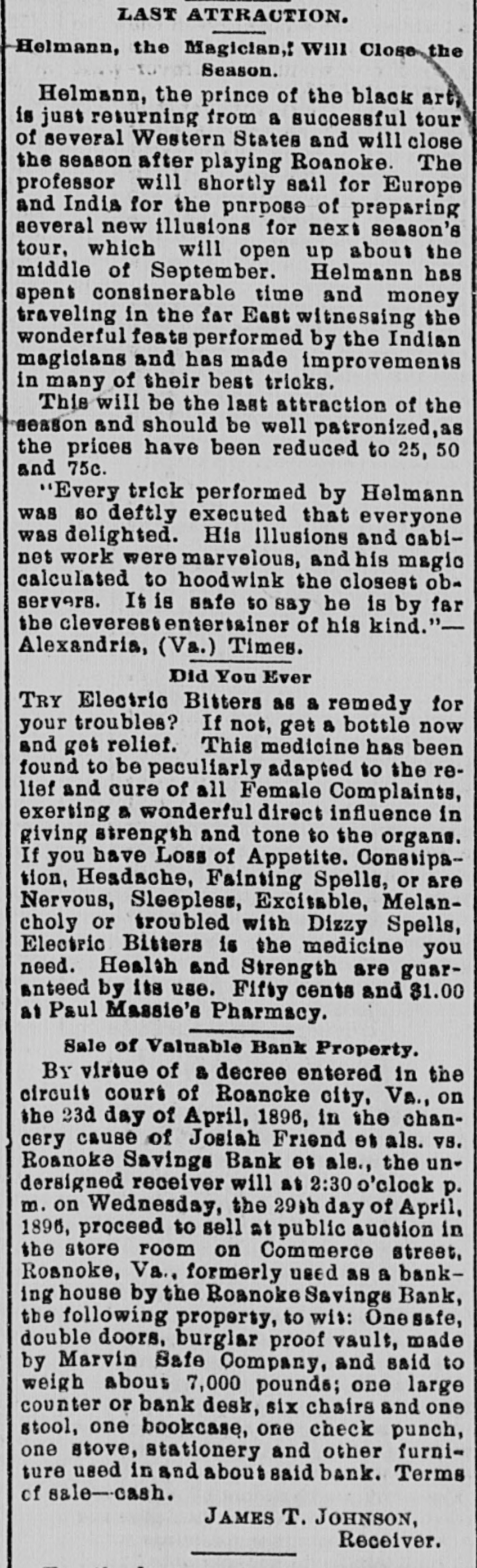 LAST ATTRACTION. Helmann, the Magician, Will Close the Season. Helmann, the prince of the black art, is just returning from a successful tour of several Western States and will close the season after playing Roanoke. The professor will shortly sail for Europe and India for the purpose of preparing several new illusions for next season's tour, which will open up about the middle of September. Helmann has spent consinerable time and money traveling in the far East witnessing the wonderful feats performed by the Indian magicians and has made improvements in many of their best tricks. This will be the last attraction of the season and should be well patronized, as the prices have been reduced to 25, 50 and 75c. "Every trick performed by Helmann was so deftly executed that everyone was delighted. His Illusions and cabinet work were marvelous, and his magic calculated to hoodwink the closest observers. It is safe to say he is by far the cleverest entertainer of his kind. Alexandria, (Va.) Times. Did You Ever TRY Electric Bitters as a remedy for your troubles? If not, get a bottle now and get relief. This medicine has been found to be peculiarly adapted to the relief and cure of all Female Complaints, exerting a wonderful direct influence in giving strength and tone to the organs. If you have Loss of Appetite. Constipation, Headache, Fainting Spells, or are Nervous, Sleepless, Excitable, Melancholy or troubled with Dizzy Spells, Electric Bitters is the medicine you need. Health and Strength are guaranteed by its use. Fifty cents and $1.00 at Paul Massie's Pharmacy. Sale of Valuable Bank Property. By virtue of & decree entered in the circuit court of Roanoke city, Va., on the 23d day of April, 1896, in the chancery cause of Josiah Friend 01 als. VS. Roanoke Savings Bank et als., the undersigned receiver will at 2:30 o'clock p. m. on Wednesday, the 291b day of April, 1896, proceed to sell at public auction in the store room on Commerce street, Roanoke, Va., formerly used as a banking house by the Roanoke Savings Bank, the following property, to wis: Onessfe, double doors, burglar proof vault, made by Marvin Safe Company, and said to weigh about 7,000 pounds; one large counter or bank desk, six chairs and one stool, one bookcase, one check punch, one stove, stationery and other furniture used in and about said bank. Terms of sale-cash. JAMES T. JOHNSON, Receiver.