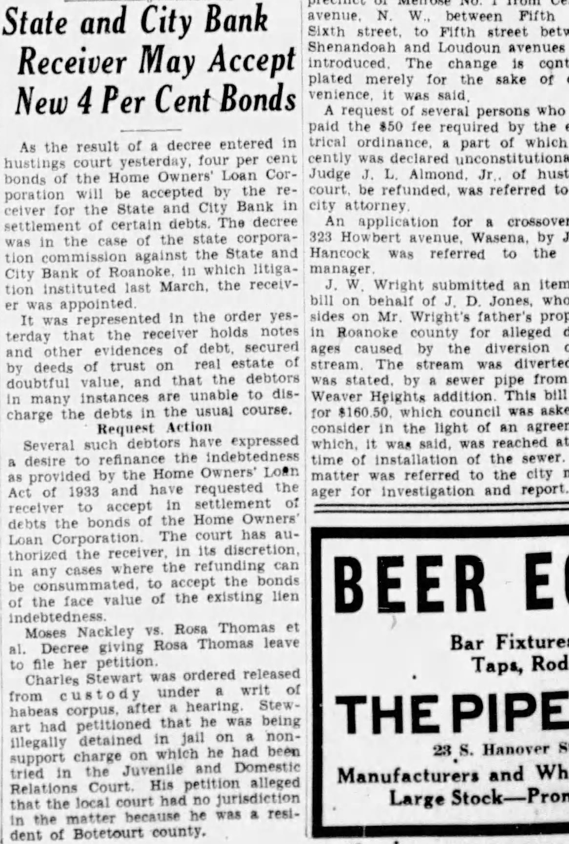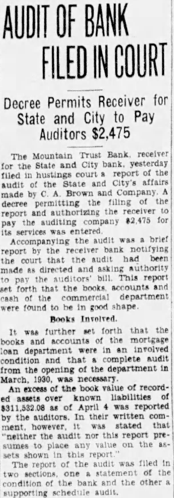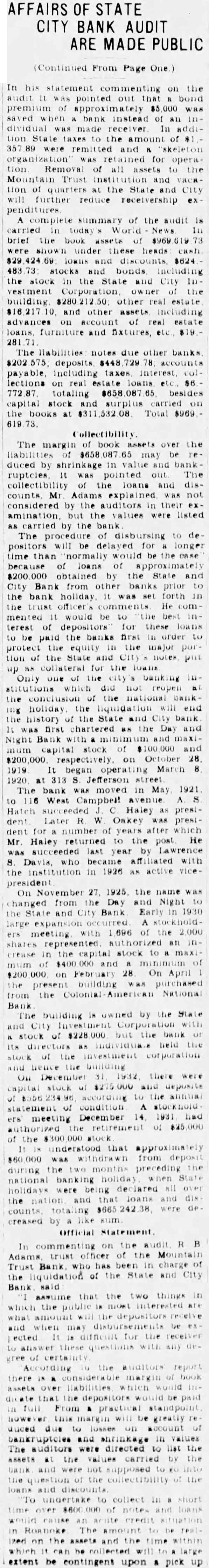 The bank was moved May. 116 West Haley Later was presiwhich Mr. Haley the year by had become The changed to the State City November 27. 1925 large expansion place. meeting which the 2,000 shares the capital and $200,000. respectively. The present purchased from the Colonial National Bank April The purchase actually by the and City vestment Corporation the valued an of owned either by bank its In the annual statement as the capital stock shown and the stock holders had capital stock from $300,000 $275,000. understood that approximately $60,000 was withdrawn from deposit during months preceding national when holidays being declared the and and diswere decreased Official Statement Mr Adams' statement follows: assume that the two things in which the public is most interested are what amount the depositors receive and when disbursements It difficult for the receiver these with any degree certainty. "According the auditors' report there margin book assets over liabilities, which indicate that the From will be greatly duced due to bankruptcies and shrinkage in values. The auditors were directed to list the assets the values carried by the and not supposed go the the collectibility of the and undertake collect in short notes and would acute credit situation Roanoke. The amount be realized on the assets and the within which can collected large extent be contingent upon pick up and an but not too will to the mean the ference between their per 40 per cent or perhaps twice that amount. WIII Be Developed. to the depositors will delayed longer than normally would the fact the City Bank had borrowed prior the For these loans the had pledged collateral portion notes. In protect equity this collateral be the best interest the for the ceiver to pay these before any disbursement is to the deposiOur first interest being to see that the the to hold the expense of liquidation mum. of receiver effected saving premium of addition, succeeded having due the State remitted are skeleIn order further assets moved the Trust Bank with exception of the Mortgage Loan Be Vacated. pending now for the sale this and, the sale completed and proved the banking ters the State and City Bank will that the audit has been comthe will ask to the Reconstruction Corporation liquidating loan accordance this granted. used to the bank and pay dend to depositors Reconstruction Finance Corporation may approve."