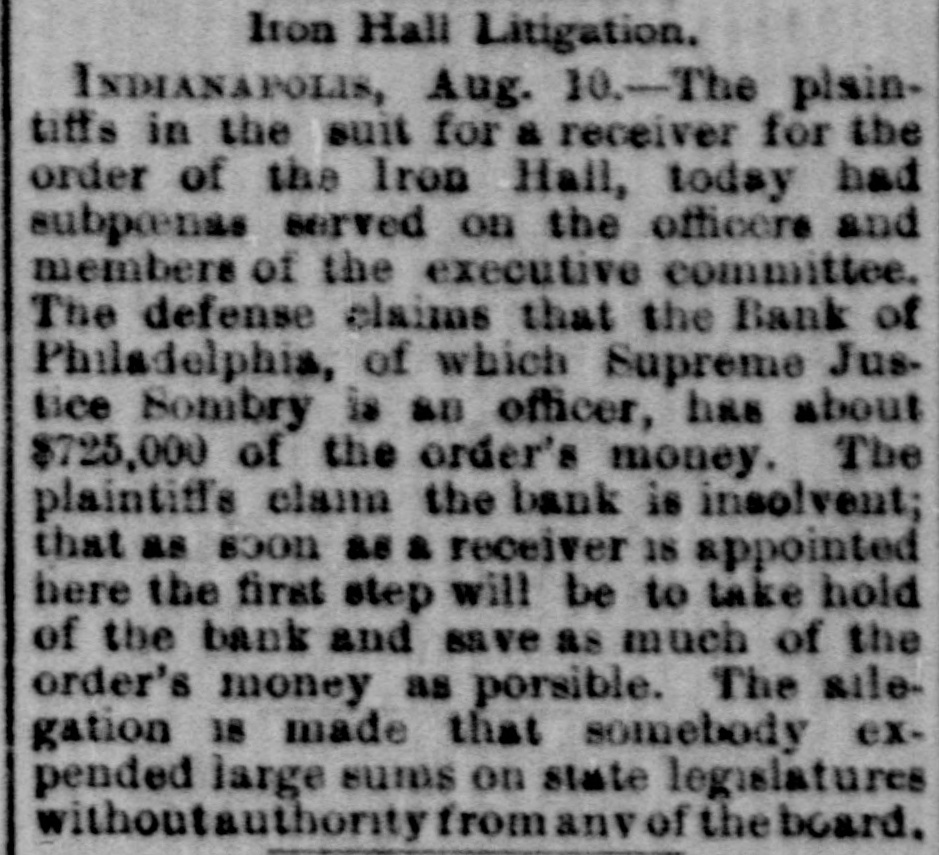 Iron Hall Litigation. INDIANAPOLIS, Aug. 10.-The plaintiffs in the suit for a receiver for the order of the Iron Hall, today had subprenas served on the officere and members of the executive committee. The defense claims that the Bank of Philadelphia, of which Supreme Justice Sombry is an officer, has about $725,000 of the order's money. The plaintiff's claim the bank is insolvent; that as soon as & receiver 18 appointed here the first step will be to take hold of the bank and save as much of the order's money as porsible. The silegation 18 made that somebody expended large sums on state legislatures withoutauthority from any of the board.