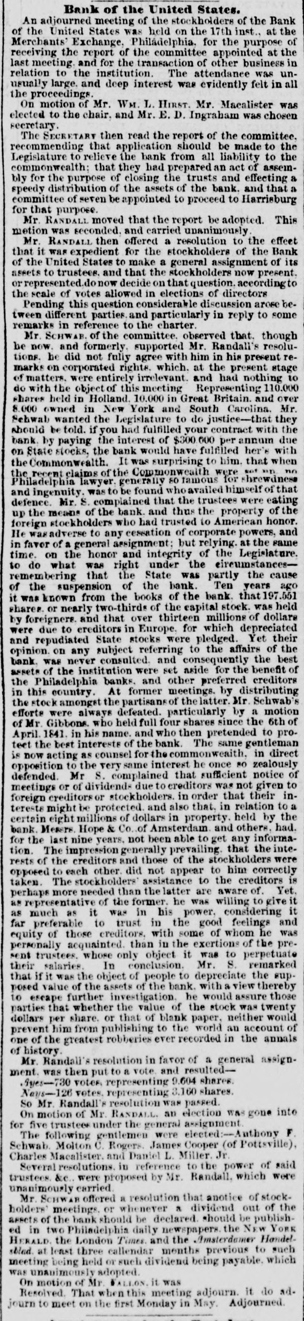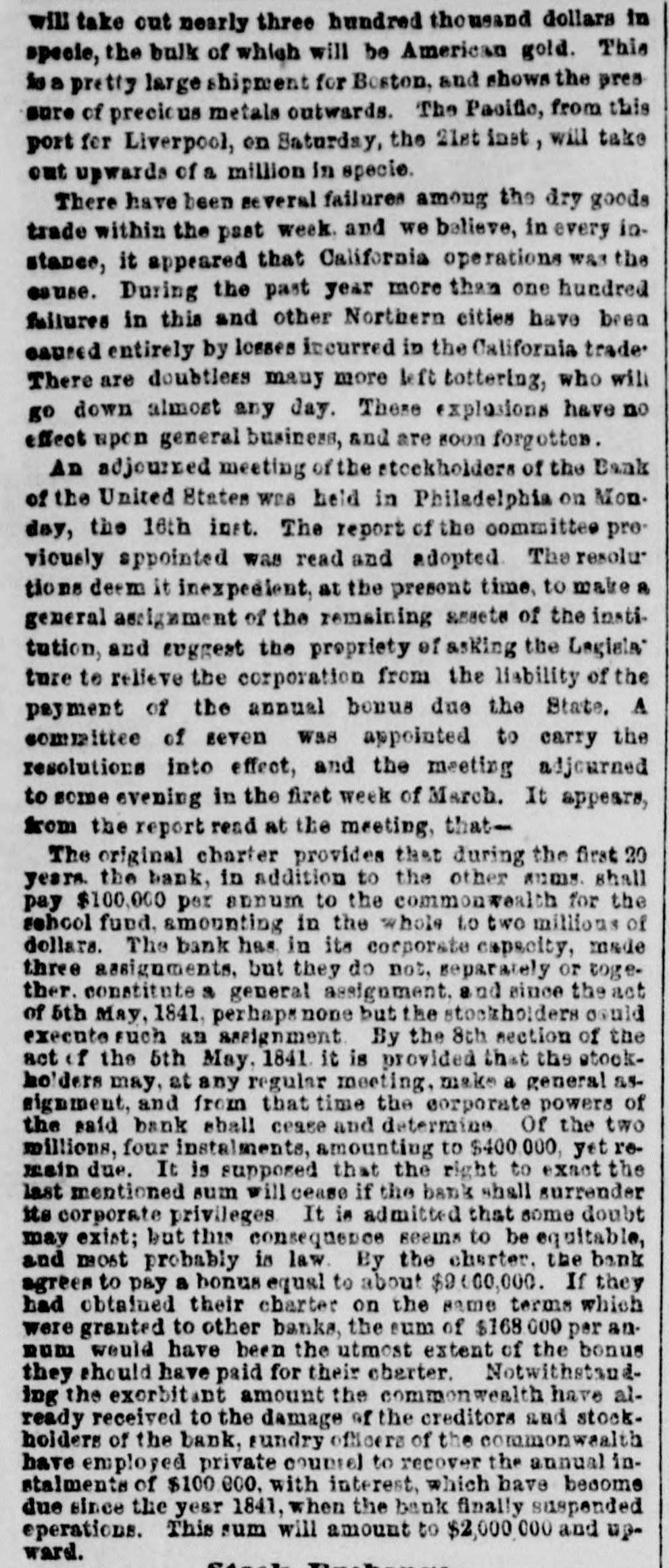will take out nearly three hundred thousand dollars in specie, the bulk of which will be American gold. This to pretty large shipment for Boston, and shows the pres sure of precious metals outwards. The Pacific, from this port for Liverpool, on Saturday, the 21st last, will take out upwards of a million in specie. There have been several failures among the dry goods trade within the past week. and we believe, in every instance, it appeared that California operations was the cause. During the past year more than one hundred failures in this and other Northern cities have been caused entirely by losses incurred in the California trade There are doubtless many more left tottering, who will go down almost any day. These explasions have no effect upon general business, and are soon forgotten. An adjoursed meeting of the stockholders of the Bank of the United States was held in Philadelphia on Mon. day, the 16th inst. The report of the committee previcusly appointed was read and adopted The resolu tions deem it inexpedient, at the present time, to make a general assignment of the remaining assets of the institution, and euggest the propriety of asking the Legisla* ture to relieve the corporation from the liability of the payment of the annual bonus due the State. A committee of seven was appointed to carry the resolutions into effect, and the meeting adjourned to some evening in the first week of March. It appears, from the report read at the meeting, thatThe original charter provides that during the first 20 years. the bank, in addition to the other aums. shall pay $100,000 per annum to the commonwealth for the school fund. amounting in the whole to two millions of dollars. The bank has in its corporate capacity, made three assignments, but they do not, separately or together. constitute a general assignment. and since the act of 5th May, 1841. perhapsnone but the stockholders could execute such an assignment By the 8th section of the act (if the 5th May, 1841. it is provided that the stockholders may, at any regular meeting, make a general assignment, and from that time the corporate powers of the said bank shall cease and determine Of the two millions, four instalments, amounting to $400.000, yet remain due. It is supposed that the right to exact the last mentioned sum will cease if the bank shall surrender its corporate privileges It is admitted that some doubt may exist; but this consequence seems to be equitable, and most probably is law. By the charter. the bank agrees to pay a bonus equal to about $9.000,000. If they had obtained their charter on the same terms which were granted to other banks, the sum of $168000 per annum would have been the utmost extent of the bonus they should have paid for their charter. Notwithstanding the exorbitant amount the commonwealth have already received to the damage of the creditors and stock. holders of the bank, Fundry officers of the commonwealth have employed private counted to recover the annual instalments of $100.000, with interest, which have become due since the year 1841, when the bank finally suspended eperations. This sum will amount to $2,000,000 and upward.