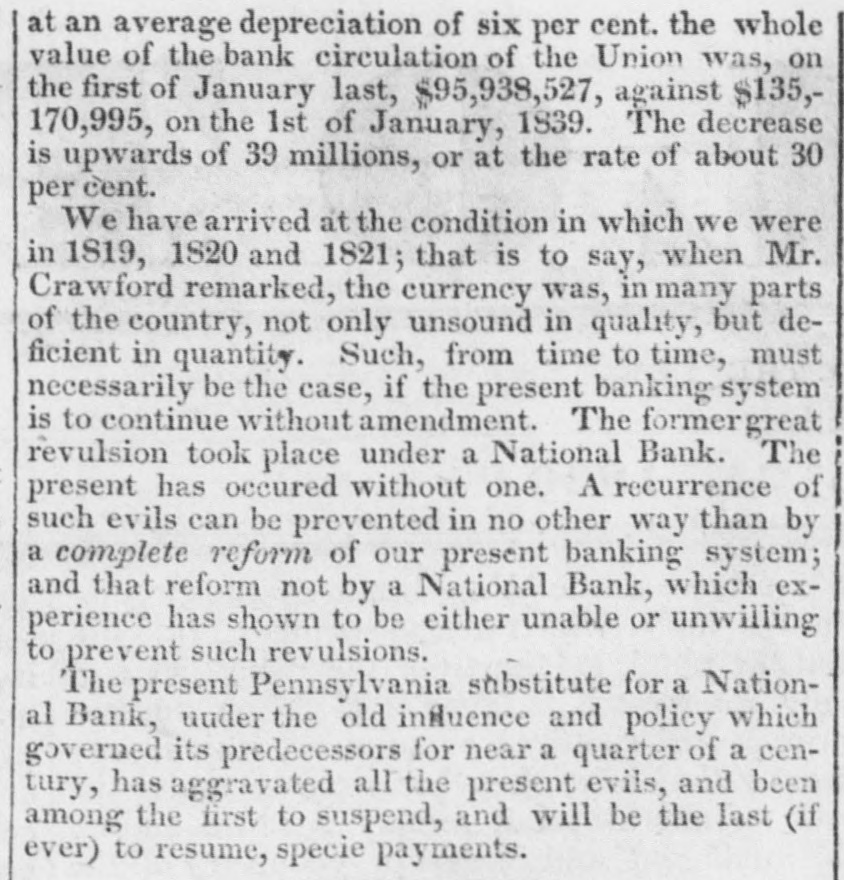 the the of our portion bank ing state, of this on account to cred their great it, not but agagements, even suspension how of resorted to. such course that the confidence and good the community can be preserved, and, in the sequel, the best interests of the stitutions themselves promoted. New dangers to the banks are also daily disclosed from the extension of thatsystem of of which they are the pillars. Formerly our foreign commerce was principally founded on an ex change of commodities, including the precious metals, and leaving in its transactions but little debt. Such not now the case. Aided by ties afforded by the banks, mere credit has become too commonly the basis of trade. Many of the banks themselves, not content with largely ating this system among others. have usurped the business while they impair the stability of the mercantile com munity they have become borrowers instead of lenders; they establish their agencies abroad they deal largely in stocks and merchandise they encourage the issue of State securities until the foreign market is glutted with them and unsatis fied with the legitimate use of their own capital and the exercise of their lawful privileges, they raise by large loans additional means for every variety of speculation The disasr attendant on this deviation from the former course of business in this country, are now shared alike by banks and individuals. to an extent of which there is perhaps no previous example in the annals of our country asa willingness of the foreign lender, and a sufficient export of our productions to meet any necessary partia payments, leave the flow of creditundist appears to be prosperous; but assoon checked by any hesitation abroad, or by any inability to make payment there in our productions. the evils of the system are disclosed. The paper currenev which might serve for domestic purposes, is useless to pay the debt due in Europe. Gold and silver are therefore drawn. in exchange for their notes, from the banks. To keep up their supply of coin, these institutions are obliged to call upon their own debtors, who pay them principally in their own notes, which are as unavailable to them as they are to the merchants to meet the foreign demand The of calls of the banks, therefore, in such emergencies, necessity ceed that demand, and produce corresponding curtailment of their accommodations and of the currency, at the very moment when the state of trade renders it most inconvenien: to be borne. The intensity of this pressure on the community is in proportion to the previous liberality of credit and consequent expansion of the currency forced sales of property are made at the time when the means of purchasing are most reduced, and the worst calamities to individuals are only at last arrested, by an open violation of their obligations by the banks.a refusal to pay specie for their notes, and an imposition upon the community of a fluctuating and depreciated currency These consequences are inherent in the present system. They are not influenced by the banks being large or small, created by National or State Governments. They are the results of the irresistible laws ot trade and credit. In the recent events which have so strikingly illustrated the certain effects of these laws, we have seen the bank of the lar. gest capital in the Union, established under a National charter, and lately strengthened, as we were authoritatively informed, by exchanging that for a State charter, with new and unusual privileges-in a condition too,as it was said, of entire soundness and great prosperity- merely unable to resist these effects, but the first to yield to them. Nor is it to be overlooked that there exists a chain of necessary dependence among a these institutions which obliges them, to great extent, to follow the course of others, notwithstanding its justice to their own immediate creditors, or injury to the particular community in which they are placed. This dependence of a bank, which is in proportion to the extent of its debts for circulation and deposites, is not merely on others in its own vicinity, but on all those which connect it with the centre of trade. Distant banks may fail, without seriously affecting those in our principal commercial cities: but the failure of the latter is felt at the extremities of the Union. The suspension at New York in 1837 was every where, with very few excep. tions, followed, as soon as it was known that recently at Philadelphia immediately affected the banks of the South and West in a similar manner. This dependence of our whole banking system on the institutions in a few large citics, is not found in the laws of their organization, but in those of trade and exchange. The banks at that centre to which currency flows,and where it is required in payments for merchandise, hold the power of controlling those in regions whence it comes, while the latter possess no means of restraining them so that the value of individual property, the prosperity of trade, through the whole interior of the country, are made to depend on the good or bad management of the banking institutions in the great seats of trade on the seaboard. But this chain of dependence does not stop here. It does not terminate at Philadelphia or New York. It reaches across the ocean, and ends in London, the centre of the credit system. The same laws of trade which gave the banks in our principal cities power over the whole banking system of the United States, subjects the former, in their turn, to the money power of Great Britain It is not denied that the suspension of the New York banks in 1837, which was followed in quick succession throughout the Union, was produced by an application of that power and it is now alleged in extenuation of the present condition of so large a portion of our banks, that their embarrassments have arisen from the same cause. From this influence they cannot now entirely escape, for it has its origin in the credit currencies of the two c
