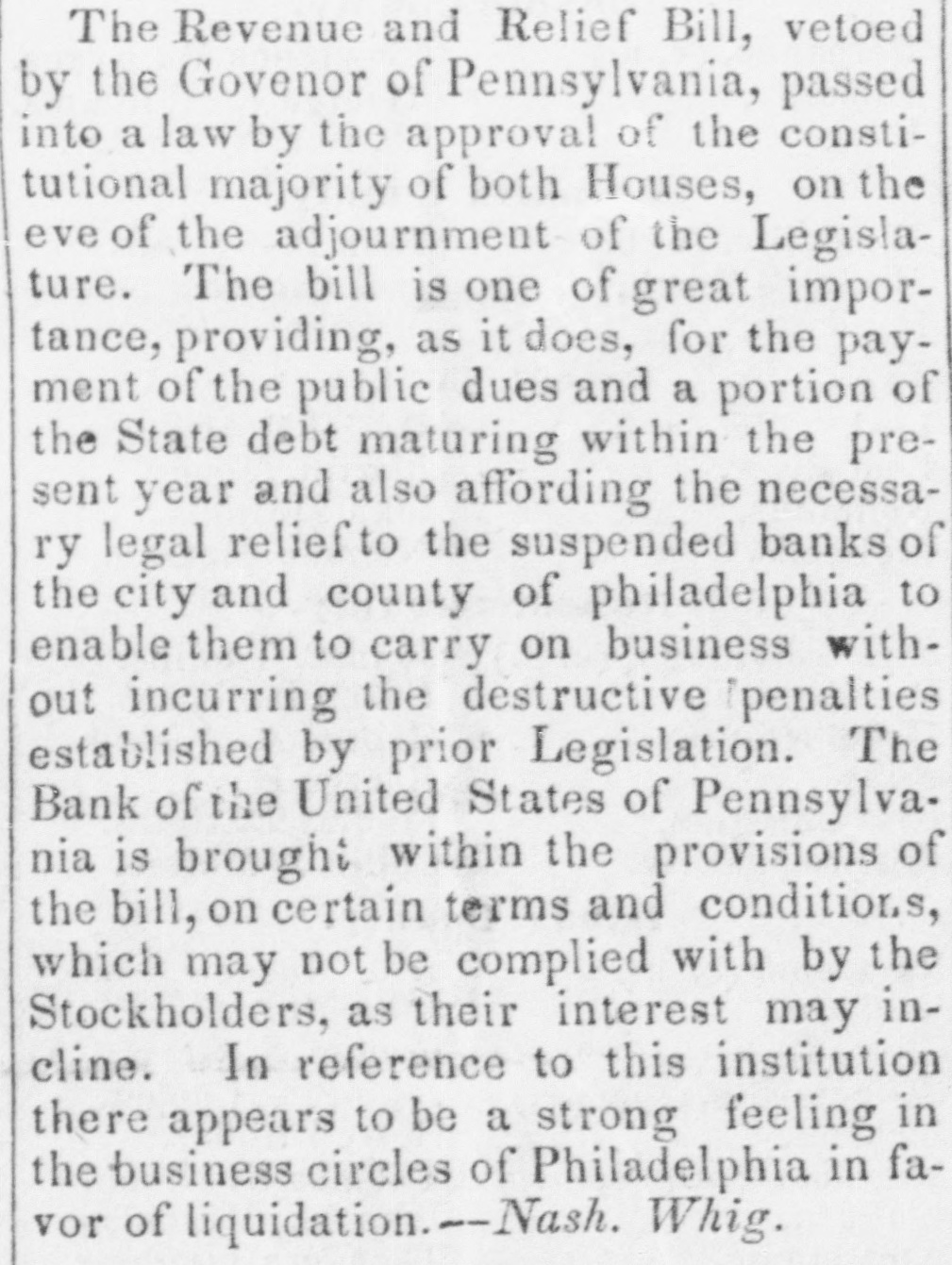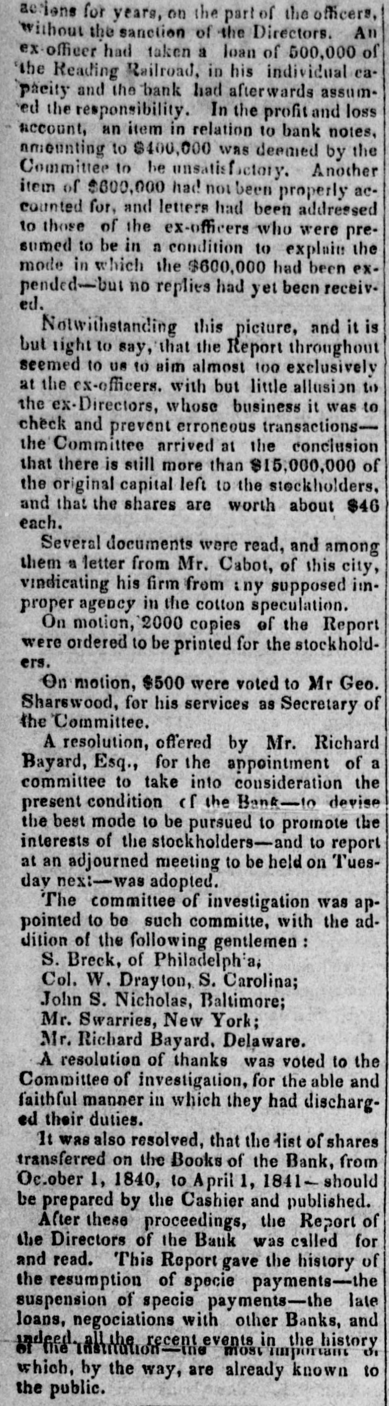 actions for years, on the part of the officers, without the sanction of the Directors. An ex-officer had taken a loan of 500,000 of the Reading Railroad, in his individual capacity and the bank had afterwards assumed the responsibility. In the profit and loss account, an item in relation to bank notes, amounting to $400,000 was deemed by the Committee to be unsatisfactory. Another item of $600,000 had not been properly accounted for, and letters had been addressed to those of the ex-officers who were presumed to be in a condition to explain the mode in which the $600,000 had been expended-but no replies had yet been received. Notwithstanding this picture, and it is but right to say, that the Report throughout seemed to us to aim almost too exclusively at the ex-officers, with but little allusion to the ex-Directors, whose business it was to check and prevent erroneous transactions-the Committee arrived at the conclusion that there is still more than $15,000,000 of the original capital left to the stockholders, and that the shares are worth about $46 each. Several documents were read, and among them a letter from Mr. Cabot, of this city, vindicating his firm from any supposed improper agency in the cotton speculation. On motion, 2000 copies of the Report were ordered to be printed for the stockholders. On motion, $500 were voted to Mr Geo. Sharswood, for his services as Secretary of the Committee. A resolution, offered by Mr. Richard Bayard, Esq., for the appointment of a committee to take into consideration the present condition of the Bank-to devise the best mode to be pursued to promote the interests of the stockholders-and to report at an adjourned meeting to be held on Tuesday next-was adopted. The committee of investigation was appointed to be such committe, with the addition of the following gentlemen: S. Breck, of Philadelphia, Col. W. Drayton, S. Carolina; John S. Nicholas, Baltimore; Mr. Swarries, New York; Mr. Richard Bayard, Delaware. A resolution of thanks was voted to the Committee of investigation, for the able and faithful manner in which they had discharged their duties. It was also resolved, that the list of shares transferred on the Books of the Bank, from Oc.ober 1, 1840, to April 1, 1841-should be prepared by the Cashier and published. After these proceedings, the Report of the Directors of the Bank was called for and read. This Report gave the history of the resumption of specie payments-the suspension of specie payments-the late loans, negociations with other Banks, and indeed all the recent events in the history of the institution-the most important which, by the way, are already known to the public.