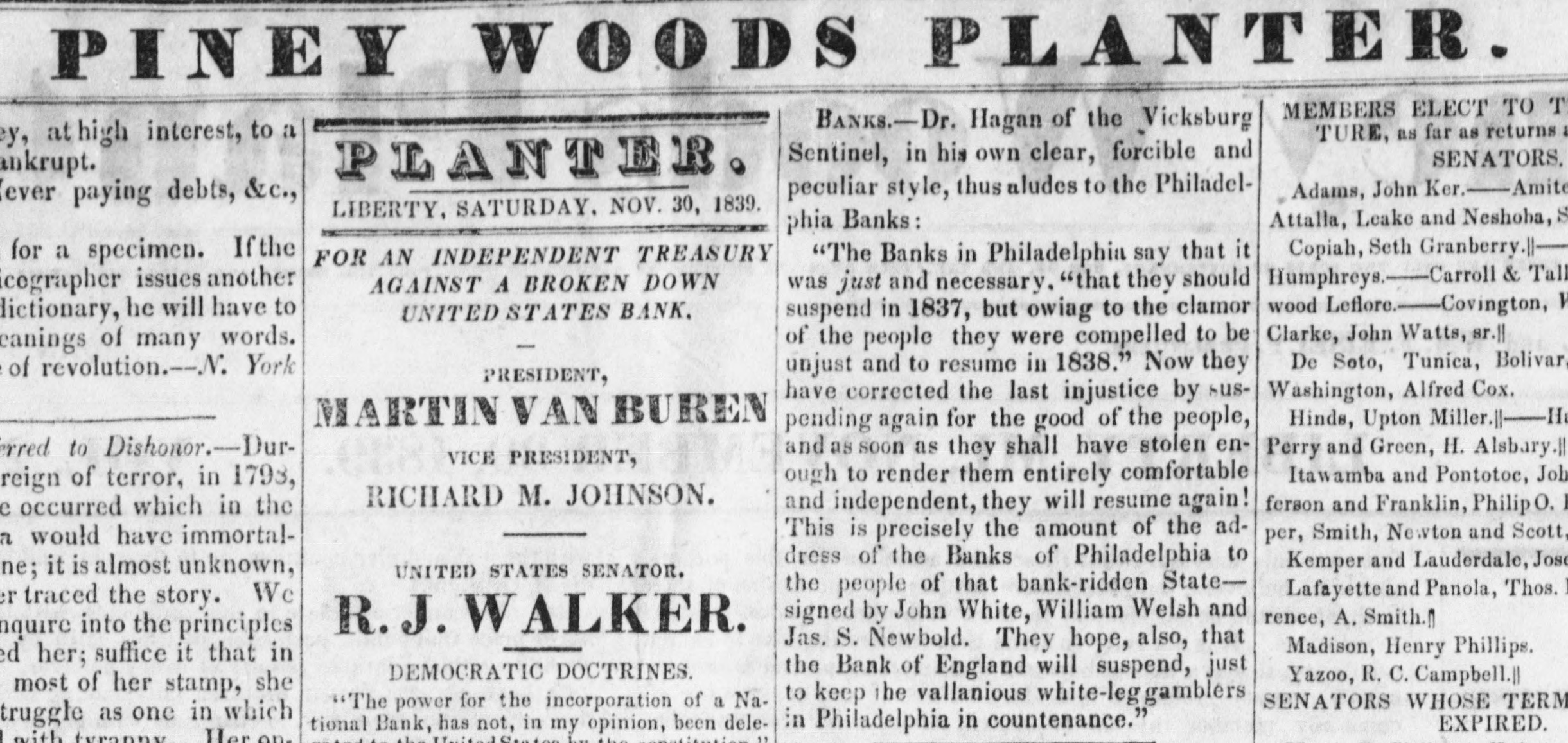 PINEY W PLANTER MEMBERS ELECT TO T BANKS.-Dr. Hagan of the Vicksburg TURE, as far as returns i ey, at high interest, to a Sentinel, in his own clear, forcible and SENATORS, ankrupt. PLANTER Adams, John Ker. Amite peculiar style, thus aludes to the Philadelever paying debts, &c., LIBERTY, SATURDAY. NOV. 30, 1839. Attalla, Leake and Neshoha, S phia Banks: Copiah, Seth Granberry.||for a specimen. If the "The Banks in Philadelphia say that it FOR AN INDEPENDENT TREASURY Carroll & Tall Humphreys. AGAINST A BROKEN DOWN was just and necessary. "that they should icographer issues another wood Leflore. Covington, V UNITED STATES BANK. suspend in 1837, but owiag to the clamor dictionary, he will have to Clarke, John Watts, sr.|| of the people they were compelled to be eanings of many words. De Soto, Tunica, Bolivar, unjust and to resume in 1838." Now they of revolution.- N. York PRESIDENT, Washington, Alfred Cox. have corrected the last injustice by susMARTIN VAN BUREN Hinds, Upton Miller.||pending again for the good of the people, rred to Dishonor.-Durand as soon as they shall have stolen enPerry and Green, H. Alsbary. VICE PRESIDENT, Itawamba and Pontotoe, Job ough to render them entirely comfortable reign of terror, in 1793, RICHARD M. JOHNSON. and independent, they will resume again! ferson and Franklin, Philip O. I e occurred which in the This is precisely the amount of the adper, Smith, Newton and Scott, a would have immortaldress of the Banks of Philadelphia to Kemper and Lauderdale, Jose UNITED STATES SENATOR. ne; it is almost unknown, the people of that bank-ridden StateLafayette and Panola, Thos. 1 r traced the story. We signed by John White, William Welsh and rence, A. Smith. R. J. WALKER. nquire into the principles Jas. S. Newbold. They hope, also, that Madison, Henry Phillips. ed her; suffice it that in the Bank of England will suspend, just DEMOCRATIC DOCTRINES. Yazoo, R. C. Campbell.|| most of her stamp, she to keep the vallanious white-leg gamblers SENATORS WHOSE TERM The power for the incorporation of a Natruggle as one in which EXPIRED. in Philadelphia in countenance." tional Bank, has not, in my opinion, been delewith tyranny Her on. the Center has the " I
