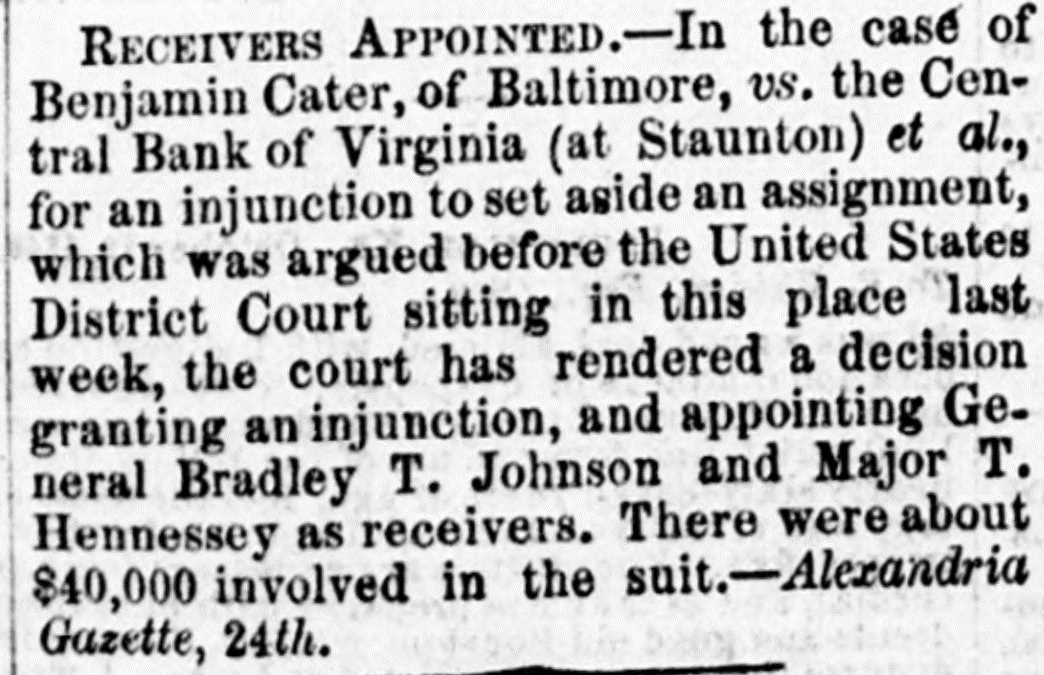 RECEIVERS APPOINTED. - In the case of Benjamin Cater, of Baltimore, VS. the Central Bank of Virginia, (at Staunton,) et al., for an injunction to set aside an assignment, which was argued before the U. S. District Court, sitting in this place, last week, the Court has rendered a decision, granting an injunction, and appointing Gen. Bradley T. Johnson and Maj. T. Hennissey as receivers. There were about $40,000 involved in the suit.