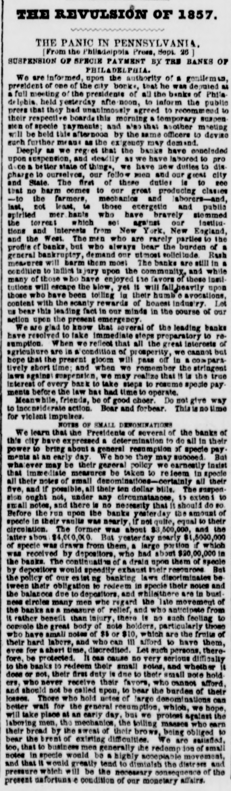 THE REVULSION OF 1857. THE PANIC IN PENNSYLVANIA. From the Philadelpola Press, dept. 26 ] SUSPENSION OF SPECIE PAYMENT BY TRE BANKS OF PHILADELPHIA. We are informed, upon the authority of a gentlemen, president of one of the city bock. that he was deputed as a full meeting of the presidente of all the banks of Phila delphia. held yesterday afte noon, to inform the public press that they had unanimously agreed to recommend to their respective boardet this morning a temporary suspen sion of specie payments; and also that another meeting will be held this afternoon by the same officers to devire each further means as the exigency may demand. Deeply as we reg: et that the banks have concluded upon suspension, and teadily as we have labored to pro doe a be tter state of things, we have new duties to dis. charge to ourselves, our fellow men and our great city and State. The first of these duties is to see that no harm comes to our great producing classes -to the farmers, mechanics and laborers-and, last, not lease, to those ecergette and public spirited mer hants who have bravely stemmed the torrent which se: against our institu. tions and Interests from New York, New England, and the West. The men who are rarely parties to the profits of banks, but who always bear the burden of a general bankruptcy, demand our utmost vollcitude Rash measures will barm them most The banks are still in a condition to inflict is jury upon the community, and while many of those . ho have enjoyed the favors of these losti. tutions will escape the blow, yet 18 will fall heavily upon those who have been toiling la their humbe avocations, content with the scanty rewards of honest industry. Let us bear this leading fact in our minds in the course of our action upon the present emergency. We are glad to know that leveral of the leading banks have resolved to take immediate steps preparatory to resumption. When we reflect that all the great Interests of agriculture are in a condition of prosperity, we cannot but hope that the present gloom will pass off in a CO paratively abort time; and when we remember the stringent laws against suspension, we may realize that 11 is the true Interest of every back to take steps to resume speate pay ments before the law has had time to operate. Meanwhile, friends, be of good cheer. Do not give way to inconsiderate action. Bear and forbear. This is no time for violent impulses. NOTES OF SMALL DENOMINATIONS We learn that the Presidente of several of the banks of this city have expressed a determination to do all in their power to bring about a general resumption or specie pay. ments at an early day. We hope they may succeed. Bat may be their general policy we earnestly Instet that immediate measures be taken to eleem in specie all their notes of small denominations-certainly all their five, and If possible, all their ten dollar bills. The saspension ought not, under any circumstances, " exten i to small notes, and there is no necessity that It should do to Before the FUD upon the banks yesterday the amount of specie in their vaults was nearly, If not quite, equal to their circulation. The former was about $3,500,000, and the latter abou $4,000,000. But yesterday nearly $1,5000,000 of specie was drawn from them, a large portion if which was received by depositors, who had about $20,00,000 in the banks. The continuation of a drain upon them of specie by depositors would speedity exhaust their resources But the policy of our exist ng banking laws discriminates be tween their obligation to redeem in specie their notes and the balances due to depositors, and whilethere are in bust. ness circles many men who regard the late movement of the banks as a measure of relief, and who anticipate from It rather benefit than injury, there is no each feeling to console the great body of note holders, particularly those who have small notes of $5 or $10, which are the fruits of their hard labors, and who can 111 afford to have them, ever for a short time, discredited. Let such persons, therefore, be protected. It cas cause no very serious difficiality to the banks to redeem their small notes, and whether it does or not, their first duty is due to their small note hold ers, who never receive their favors, who cannot afford, and should not be called upon, to bear the barden of their losses. Those who hold notes of large denominations can better walt for the general resumption, which, we hope, will take place at an early day, but we protest against the laboring men, the mechanics, the toiling masses who earn their bread by the sweat of their brows, being obliged to bear the brent of existing disculties. We are salisfied, too, that to business men generally the redemp 100 of small notes in specie would be a highly acceptable movement, and that It would greatly tend to diminish the distress and pressure which will be the necessary consequence of the present unfortuna e condition of our monetary affairs.