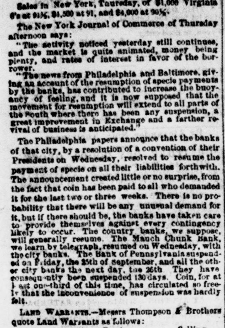 Sales in New York, Toursday, of $1,000 Virginia 6's at 91%. $1,500 at 91, and $4,000 at 90%. The New York Journal of Commerce of Thursday afternoon says: "The activity noticed yesterday still continues, and the market to quite animated, money being Dienty, and rates of interest in favor of the borrower. "The news from Philadelphia and Baltimore. giving an account of the resumption of specie payments by the banks, has contributed to increase the buoyancy of feeling. and it is now supposed that the movement for resumption will extend to all parts of the Mouth where there has been any suspension, a great improvement in Exchange and a farther revival of business is anticipated." The Philadelphia papers announce that the banks of that city, by a resolution of a convention of their Presidents on Wednesday, resolved to resume me the payment of specie on all their liabilities forthwith. The announcement created little or no surprise, from the fact that coin has been paid to all who demanded it for the last two or three weeks. There is no probability that there will be any unusual demand for it, but If there should be, the banks have taken care to provide themselves against every contingency likely to occur. The country banks, we suppose, will generally resume. The Mauch Chunk Bank, we learn by telegraph, resumed on Wednesday, with the city banks. The Bank of Pennsylvania suspended on Friday, the 25th of September, and all the othor city banks the next day. the 26th They have conseque ntly been suspended 130 days. Coin, for at 1 st one-third of this time, has circulated 80 freeIv that the inconvenience of suspension was hardly felt. LAND WARRANTS.-Messrs Thompson & Brothers quote Land Warsants as follows: