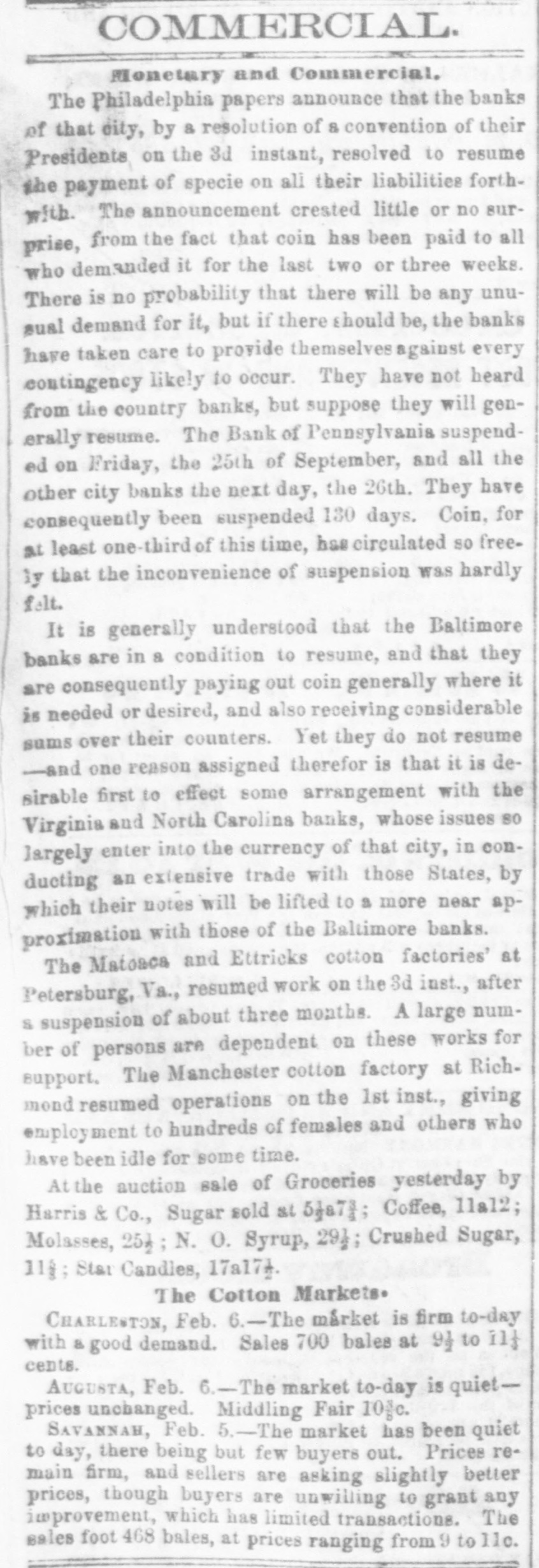 COMMERCIAL Monetary and Commercial. The Philadelphia papers announce that the banks of that city, by & resolution of 8 convention of their Presidents on the 3d instant, resolved to resume the payment of specie on all their liabilities forthwith. The announcement created little or no surprise, from the fact that coin has been paid to all who demanded it for the last two or three weeks. There is no probability that there will be any unusual demand for it, but if there should be, the banks have taken care to provide themselves against every contingency likely to occur. They have not heard from the country banks, but suppose they will generally resume. The Bank of Pennsylvania suspended on Friday, the 25th of September, and all the other city banks the next day, the 26th. They have consequently been suspended 130 days. Coin, for at least one-third of this time, has circulated so freely that the inconvenience of suspension was hardly felt. It is generally understood that the Baltimore banks are in a condition to resume, and that they are consequently paying out coin generally where it is needed or desired, and also receiving considerable sums over their counters. Yet they do not resume -and one reason assigned therefor is that it is desirable first to effect some arrangement with the Virginia and North Carolina banks, whose issues 80 largely enter into the currency of that city, in conducting an extensive trade with those States, by which their notes will be lifted to a more near approximation with those of the Baltimore banks. The Matoaca and Ettricks cotton factories' at Petersburg, Va., resumed work on the 3d inst., after & suspension of about three months. A large number of persons are dependent on these works for support. The Manchester cotton factory at Richmond resumed operations on the 1st inst., giving employment to hundreds of females and others who have been idle for some time. the auction sale of Groceries yesterday by Harris & Co., Sugar sold at 54871; Coffee, 11a12; Molasses, 251; N. 0. Syrup, 291; Crushed Sugar, 111; Stat Candles, 17a174. The Cotton Markets. CHARLESTON, Feb. 6.-The mårket is firm to-day with & good demand. Sales 700 bales at 91 to ilf cents. AUGUSTA, Feb. 6.-The market to-day is quietprices unchanged. Middling Fair 10gc. SAVANNAH, Feb. 5.-The market has been quiet to day, there being but few buyers out. Prices remain firm, and sellers are asking slightly better prices, though buyers are unwilling to grant any improvement, which has limited transactions. The sales foot 468 bales, at prices ranging from9 to 11c.