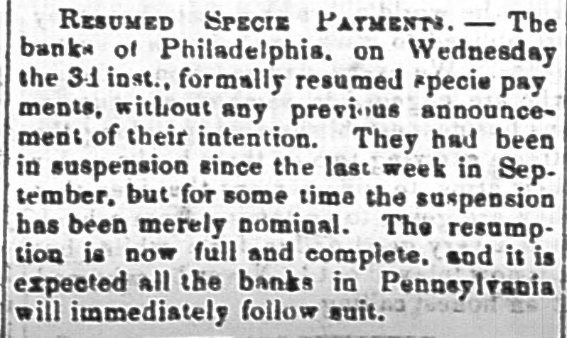 RESUMED SPECIE PAYMENTS. The banks of Philadelphia, on Wednesday the 31 inst., formally resumed specie payments, without any previous announcement of their intention. They had been in suspension since the last week in September, but for some time the suspension has been merely nominal. The resumption is now full and complete, ... (Cooper's Clarksburg Register, 1858-02-12).