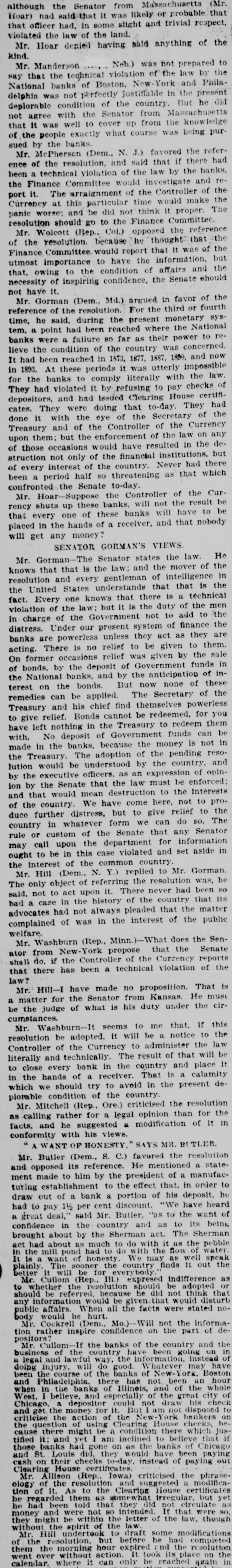 kind. Neb.) was not prepared to Mr. Manderson say that the technical violation of the law by the National banks of Boston. New-York and Philadelphia was not perfectly justifiable in the present deplorable condition of the country. But he did not agree with the Senator from Massachuset tts that It was well to cover up from the knowledge of the people exactly what course was being pursued by the banks. Mr. McPherson (Dem., N. J.) favored the reference of the resolution, and said that if there had been a technical violation of the law by the banks, the Finance Committee would investigate and report it. The arraignment of the Controller of the Currency at this particular time would make the panic worse: and he did not think it proper. The resolution should go to the Finance Committee. Mr. Wolcott (Rep., Col.) opposed the reference of the resolution. because he thought that the Finance Committee would report that it was of the utmost importance to have the information, but that, owing to the condition of affairs and the necessity of inspiring confidence, the Senate should not have it. Mr. Gorman (Dem., Md.) argued in favor of the reference of the resolution. For the third or fourth time, he said, during the present monetary system. a point had been reached where the National banks were a failure so far as their power to relieve the condition of the country was concerned. It had been reached in 1873, 1877, 1887, 1890, and now in 1893. At these periods it was utterly impossible for the banks to comply literally with the law. They had violated it by refusing to pay checks of depositors, and had issued Clearing House certificates. They were doing that to-day. They had done it with the eye of the Secretary of the Treasury and of the Controller of the Currency upon them; but the enforcement of the law on any of those occasions would have resulted in the destruction not only of the financial institutions, but of every interest of the country. Never had there been a period half SO threatening as that which confronted the Senate to-day. Mr. Hoar-Suppose the Controller of the Currency shuts up these banks, will not the result be that every one of these banks will have to be placed in the hands of a receiver, and that nobody will get any money? SENATOR GORMAN'S VIEWS. Mr. Gorman-The Senator states the law. He knows that that is the law: and the mover of the resolution and every gentleman of intelligence in the United States understands that that is the fact. Every one knows that there is a technical violation of the law: but it is the duty of the men in charge of the Government not to add to the distress. Under our present system of finance the banks are powerless unless they act as they are acting. There is no relief to be given to them. On former occasions relief was given by the sale of bonds, by the deposit of Government funds in the National banks, and by the anticipation of interest on the bonds. But now none of these remedies can be applied. The Secretary of the Treasury and his chief find themselves powerless to give relief. Bonds cannot be redeemed, for you have left nothing in the Treasury to redeem them with. No deposit of Government funds can be made in the banks, because the money is not in the Treasury. The adoption of the pending resolution would be understood by the country, and by the executive officers, as an expression of opinion by the Senate that the law must be enforced; and that would mean destruction to the interests of the country. We have come here, not to produce further distress, but to give relief to the country in whatever form we can do SO. The rule or custom of the Senate that any Senator may call upon the department for information ought to be in this case violated and set aside in the interest of the common country Mr. Hill (Dem., N. Y.) replied to Mr. Gorman. The only object of referring the resolution was, he said, not to act upon it. There never had been 80 bad a case in the history of the country that its advocates had not always pleaded that the matter complained of was in the interest of the public welfare. Mr. Washburn (Rep., Minn.)-What does the Senator from New-York propose that the Senate shall do. if the Controller of the Currency reports that there has been a technical violation of the law? Mr. Hill-I have made no proposition. That is a matter for the Senator from Kansas. He must be the judge of what is his duty under the circumstances. Mr. Washburn-It seems to me that. if this resolution be adopted, it will be a notice to the Controller of the Currency to administer the law literally and technically. The result of that will be to close every bank in the country and place It in the hands of a receiver. That is a calamity which we should try to avoid in the present deplorable condition of the country Mr. Mitchell (Rep., Ore.) criticised the resolution as calling rather for a legal opinion than for the facts, and he suggested a modification of it in conformity with his views. A WANT OF HONESTY.' SAYS MR. TLER. Mr. Butler (Dem., S. C.) favored the resolution and opposed its reference. He mentioned a statement made to him by the president of a manufacturing establishment to the effect that, in order to draw out of a bank a portion of his deposit, he had to pay 1½ per cent discount. "We have heard a great deal," said Mr. Butler, "as to the want of confidence in the country and as to its being brought about by the Sherman act. The Sherman act had about as much to do with it as the pebble in the mill pond had to do with the flow of water It is a want of honesty. We may as well speak plainly. The sooner the country finds It out the better It will be for everybody Mr. Cullom (Rep. III.) expresed indifference as to whether the resolution should be adopted or should be referred because he did not think that any information would be given that would disturb public affairs. When all the facts were stated nobody would be hurt. Mr. Cockrell (Dem. Mo.)-Will not the informa