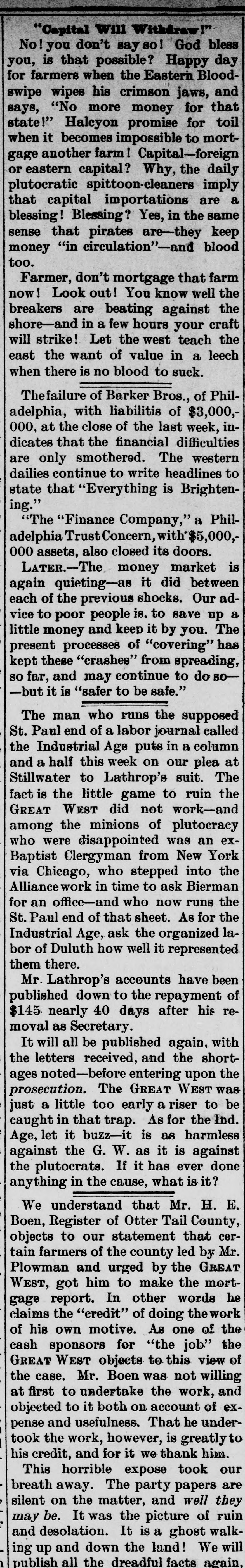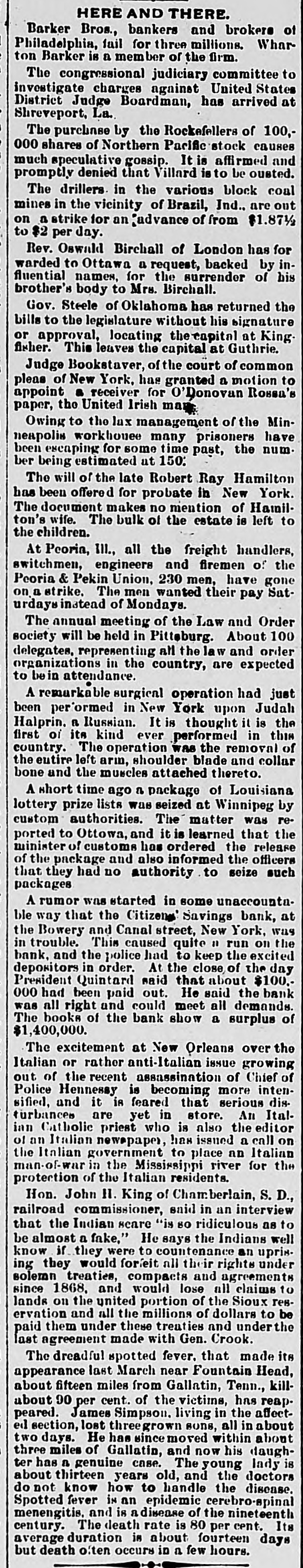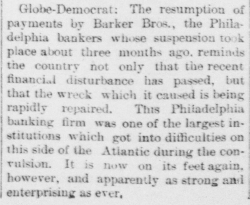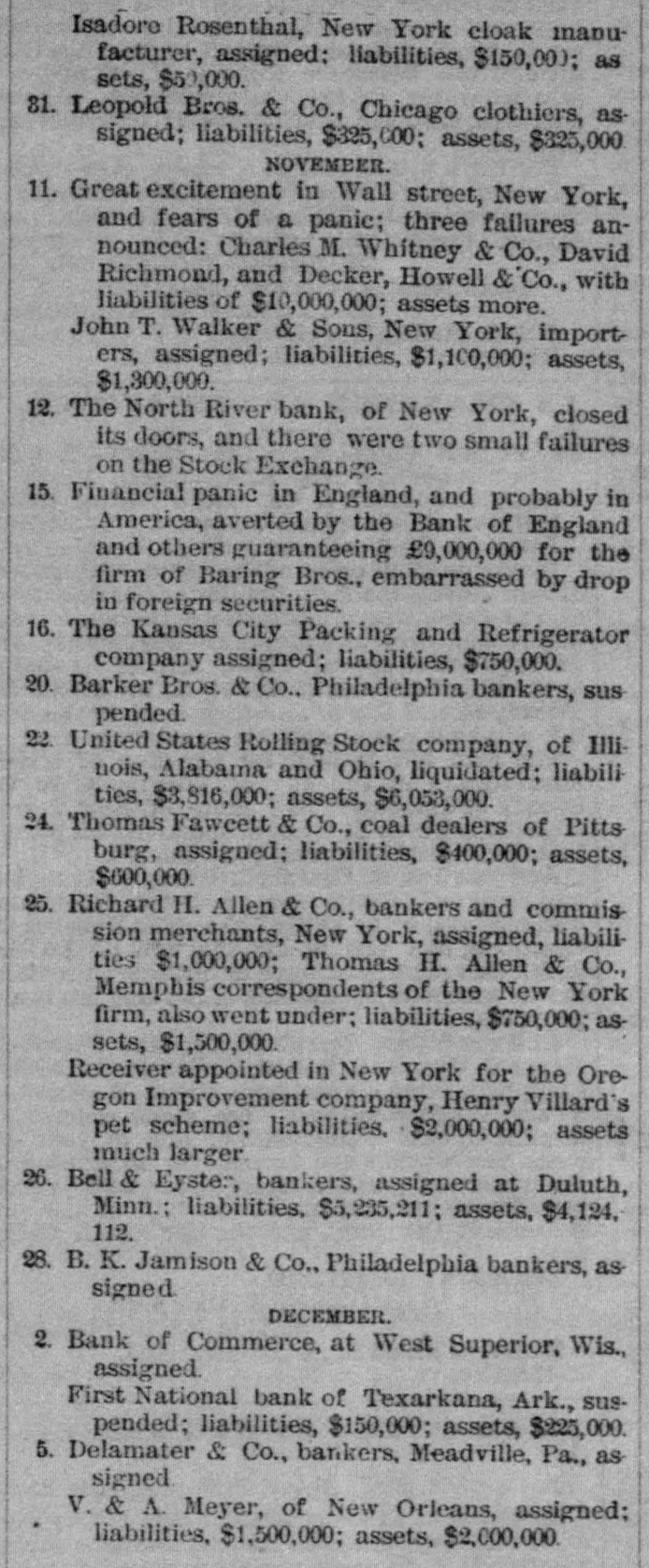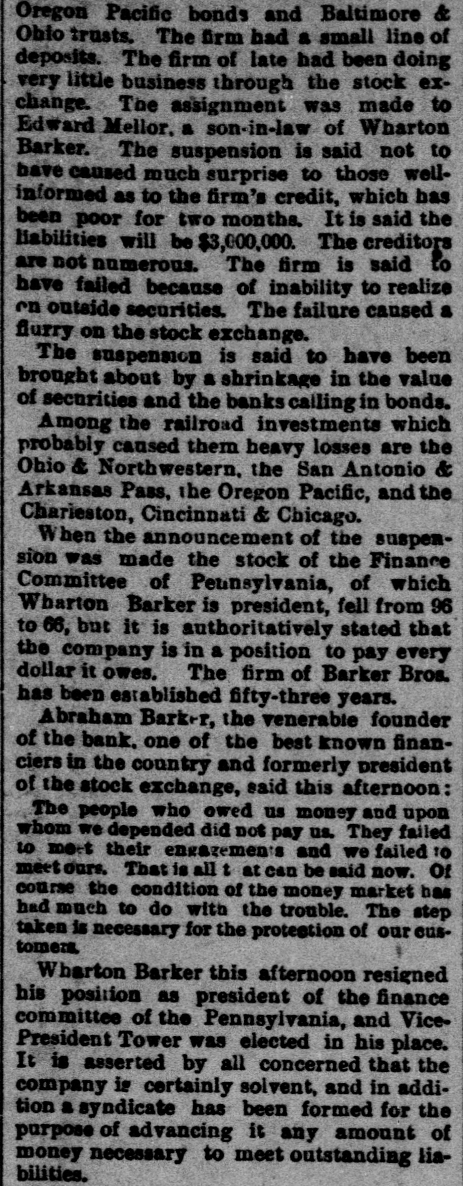 Oregon Pacific bonds and Baltimore & Ohio trusts. The firm had a small line of deposits. The firm of late had been doing very little business through the stock exchange. The assignment was made to Edward Mellor. a son-in-law of Wharton Barker. The suspension is said not to have caused much surprise to those wellinformed as to the firm's credit, which has been poor for two months. It is said the liabilities will be $3,000,000. The creditors are not numerous. The firm is said to have failed because of inability to realize en outside securities. The failure caused a flurry on the stock exchange. The suspension is said to have been brought about by a shrinkage in the value of securities and the banks calling in bonds. Among the railroad investments which probably caused them heavy losses are the Ohio & Northwestern, the San Antonio & Arkansas Pass, the Oregon Pacific, and the Charieston, Cincinnati & Chicago. When the announcement of the suspension was made the stock of the Finance Committee of Petnesylvania, of which Wharton Barker is president, fell from 96 to 66, but it is authoritatively stated that the company is in a position to pay every dollar it owes. The firm of Barker Bros. has been established fifty-three years. Abraham Barkr, the venerable founder of the bank. one of the best known financiers in the country and formerly president of the stock exchange, said this afternoon: The people who owed us money and upon whom we depended did not pay us. They failed to me.t their envarements and we failed 10 meetours That is all t at can be said now. Of course the condition of the money market has had much to do with the trouble. The step taken is necessary for the protection of our customera Wharton Barker this afternoon resigned his position as president of the finance committee of the Pennsylvania, and VicePresident Tower was elected in his place. It is asserted by all concerned that the company is certainly solvent, and in addition a syndicate has been formed for the purpose of advancing it any amount of money necessary to meet outstanding liabilities.
