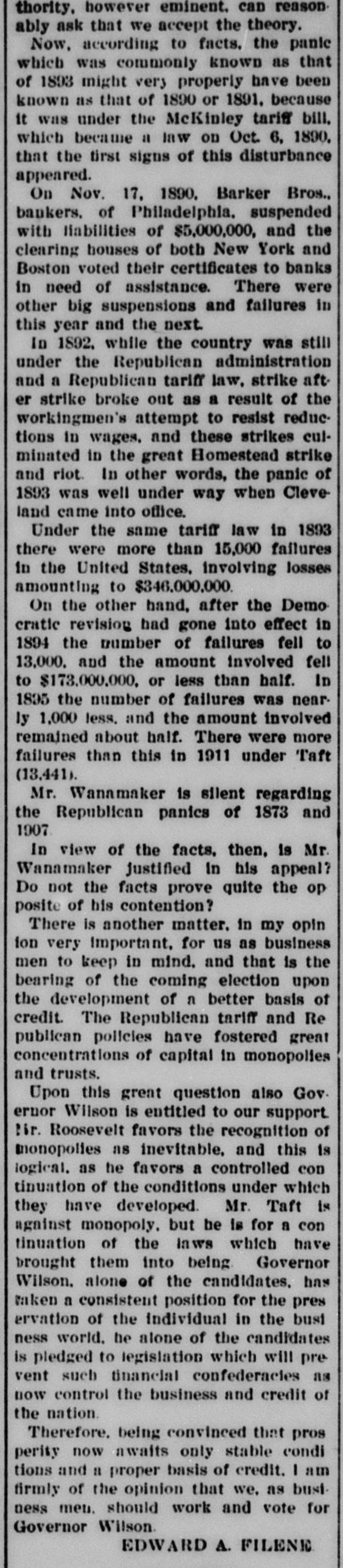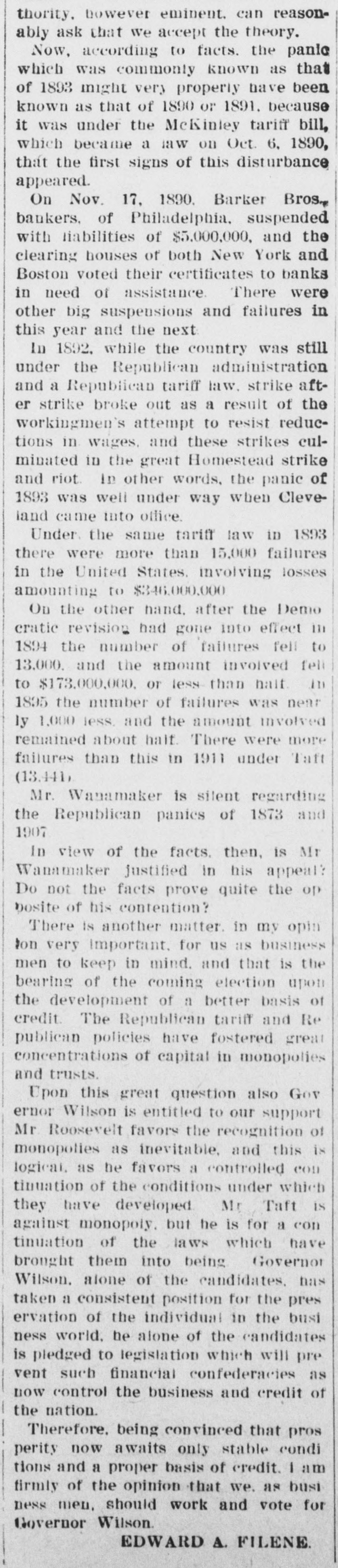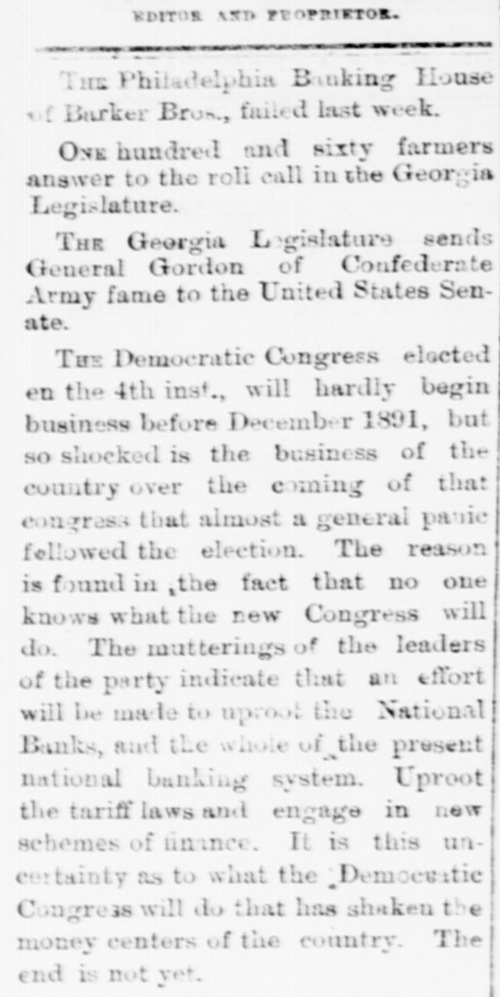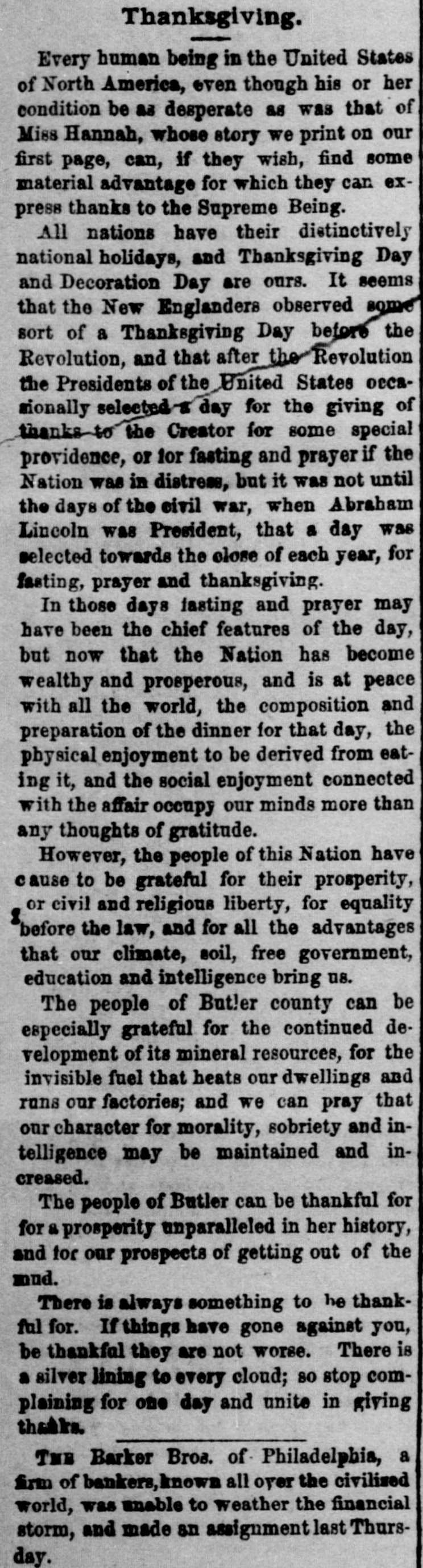 Oregon Pacific bonds and Baltimore & Ohio trusts. The firm had a small line of deposits. The firm of late had been doing very little business through the stock exchange. The assignment was made to Edward Mellor. a son-in-law of Wharton Barker. The suspension is said not to have caused much surprise to those wellinformed as to the firm's credit, which has been poor for two months. It is said the liabilities will be $3,000,000. The creditors are not numerous. The firm is said to have failed because of inability to realize en outside securities. The failure caused a flurry on the stock exchange. The suspension is said to have been brought about by a shrinkage in the value of securities and the banks calling in bonds. Among the railroad investments which probably caused them heavy losses are the Ohio & Northwestern, the San Antonio & Arkansas Pass, the Oregon Pacific, and the Charieston, Cincinnati & Chicago. When the announcement of the suspension was made the stock of the Finance Committee of Petnesylvania, of which Wharton Barker is president, fell from 96 to 66, but it is authoritatively stated that the company is in a position to pay every dollar it owes. The firm of Barker Bros. has been established fifty-three years. Abraham Barkr, the venerable founder of the bank. one of the best known financiers in the country and formerly president of the stock exchange, said this afternoon: The people who owed us money and upon whom we depended did not pay us. They failed to me.t their envarements and we failed 10 meetours That is all t at can be said now. Of course the condition of the money market has had much to do with the trouble. The step taken is necessary for the protection of our customera Wharton Barker this afternoon resigned his position as president of the finance committee of the Pennsylvania, and VicePresident Tower was elected in his place. It is asserted by all concerned that the company is certainly solvent, and in addition a syndicate has been formed for the purpose of advancing it any amount of money necessary to meet outstanding liabilities.
