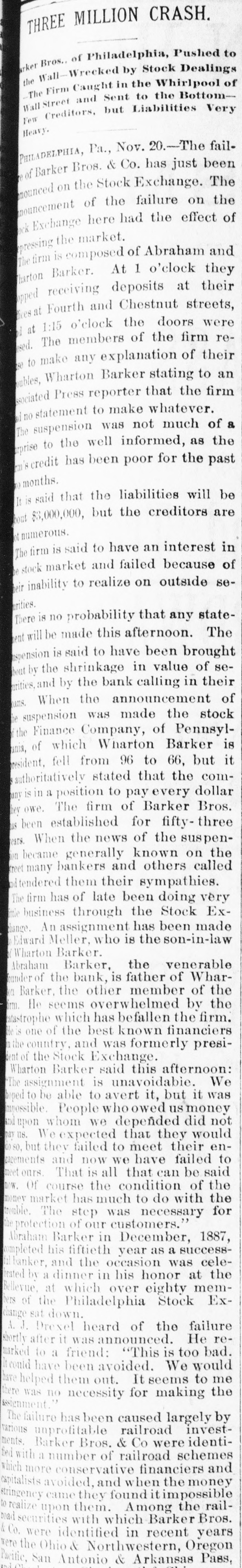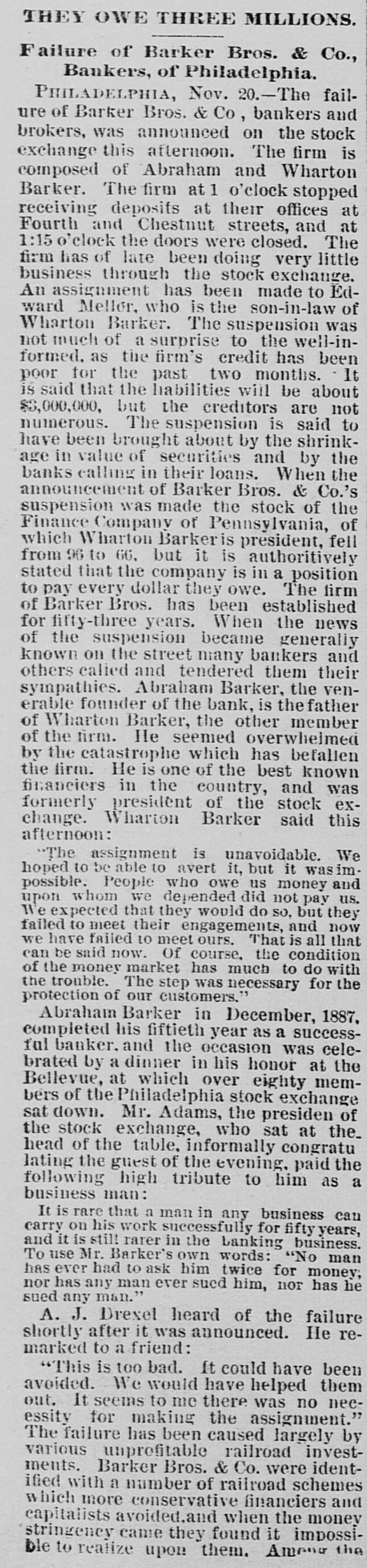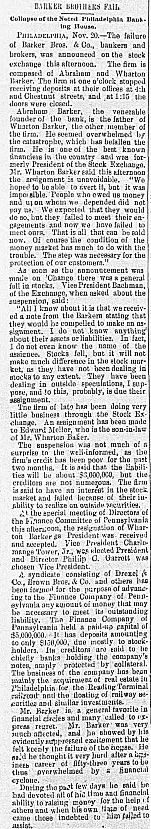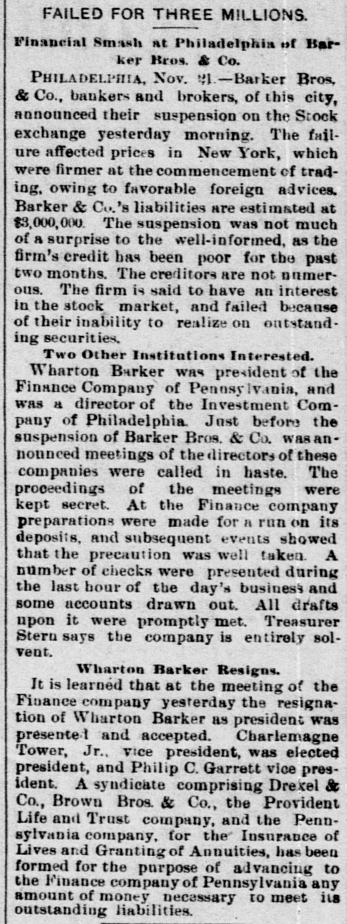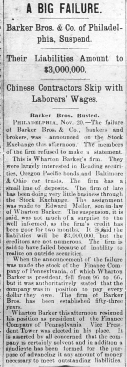 The Barker Bros. & Co. Failure-Well Known Financiers. PHILADELPHIA. Nov. 20.-Abraham Barker, founder of Barker Broe. & Co., bankere and brokers, who failed today, was one of the best financiers in the country and was formerly president of the Stock Exchrage. Wharton Barker. another member of the firm said this afternoon: "The assignment was unavoidable, as the people who owed us money. upon whom we depended, did not pay us. Of course the condition of the money market has much to do with the trouble. The step was necessary for the protection of our customers." The first matter which brought the house prominently before the general public was the announcement in 1877-78 that they had become financial agents for the Russian government in the United States. This mission was at that time highly important in view of a war between England and Russia, which then seemed imminent. In carrying out the instructions of the Russian government, Barker Bros. & Co. procured four ships of war, suitable ordinance, and completely armed and equipped them. The total expenditure amounted to several millions dollars the whole transaction was consumated to the utmost satisfaction of Russia. Wharton Barker, president of the finance company in Pennsylvania, was director of a finance company in Philadelphia, of which he was formerly vice president. At the finance company preparations were made for an anticipated run on deposits and a number of checks presented during the last hour of the day's business and some accounts drawn out. All drafts were promptly met, and Treasurer Stearns assured a number of persons who had an account there, that the company was entirely sol vent, and would pay everything presented in form of check or other demands. Failure Barker Bros. & Co., was caused largely by various unprofitable investments. They were identified with a number of railroad schemes which prudent financiers and capitalists avoided when the money stringency came found it impossible to realize upon them. A syndicate consisting of Drexel & Co., Brown Bros, & Co., Provident and Trust Co. and Pennsylvania Co. for the insurance of lives and granting of annuities has been formed for the purpose of advancing to the finance in the State of Pennsylvania any amount of money that may be necessary to meet outetanding liabilities. It is asserted that the company is certainly solvent and with the assistance of the syndicate will be able to tide over the crisis in its affairs caused by the failure of Barker.