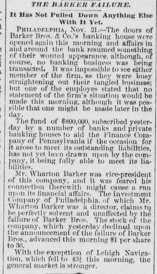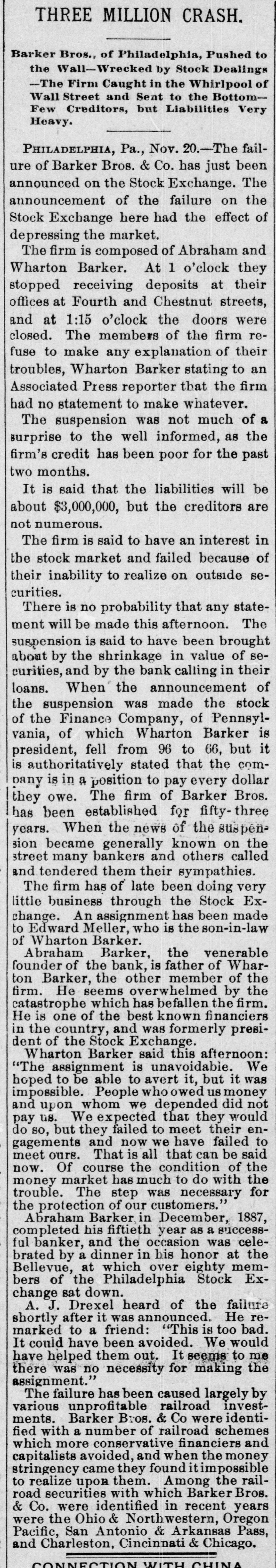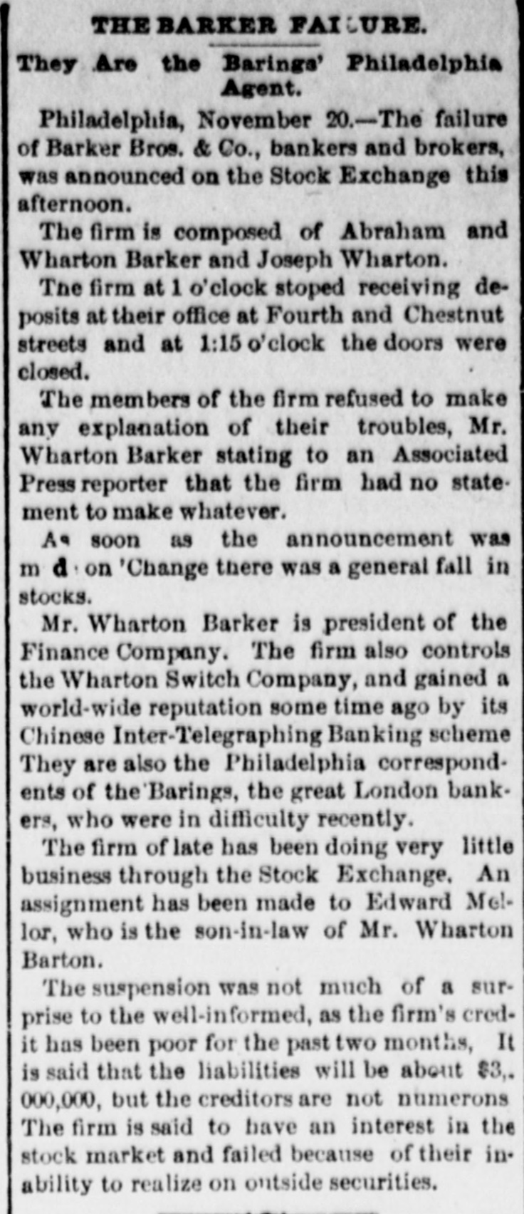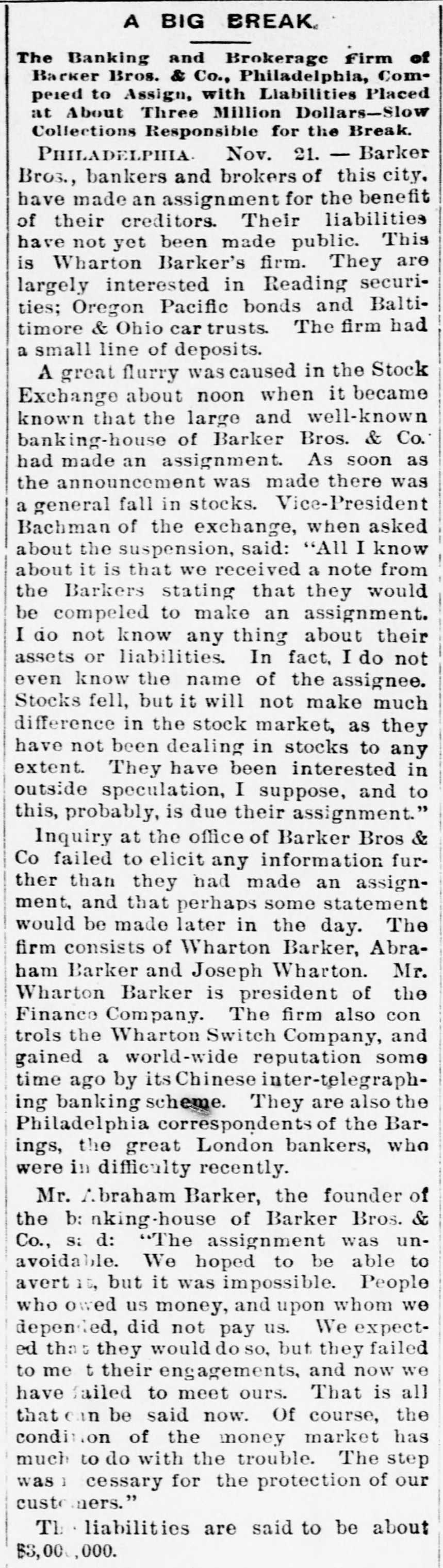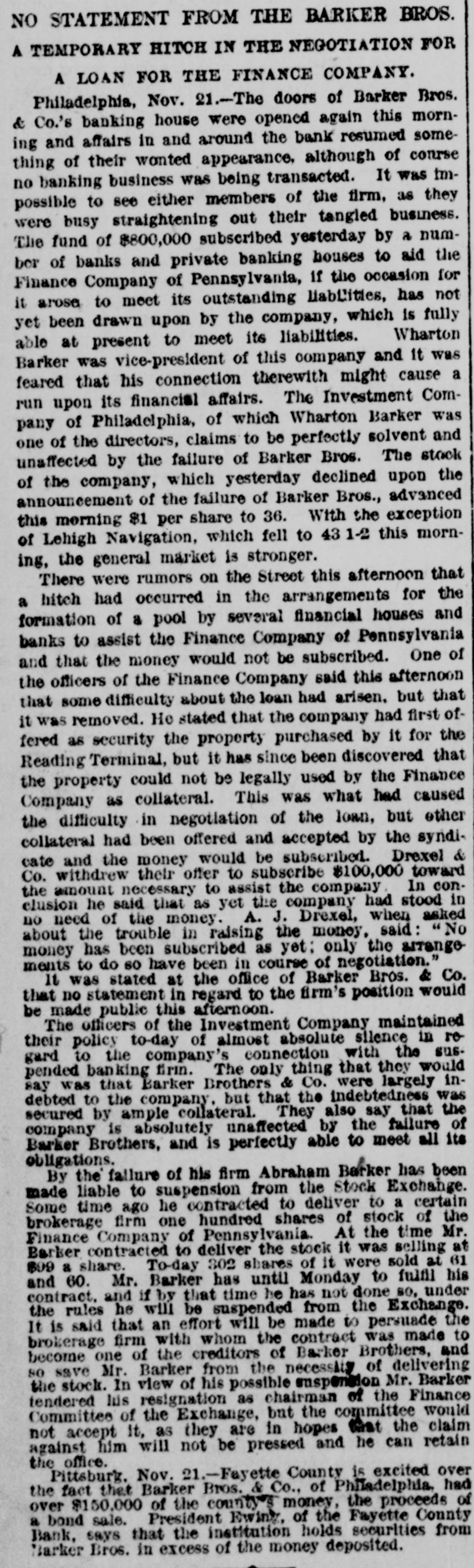 The Barker Bros. & Co. Failure-Well Known Financiers. PHILADELPHIA. Nov. 20.-Abraham Barker, founder of Barker Broe. & Co., bankere and brokers, who failed today, was one of the best financiers in the country and was formerly president of the Stock Exchrage. Wharton Barker. another member of the firm said this afternoon: "The assignment was unavoidable, as the people who owed us money. upon whom we depended, did not pay us. Of course the condition of the money market has much to do with the trouble. The step was necessary for the protection of our customers." The first matter which brought the house prominently before the general public was the announcement in 1877-78 that they had become financial agents for the Russian government in the United States. This mission was at that time highly important in view of a war between England and Russia, which then seemed imminent. In carrying out the instructions of the Russian government, Barker Bros. & Co. procured four ships of war, suitable ordinance, and completely armed and equipped them. The total expenditure amounted to several millions dollars the whole transaction was consumated to the utmost satisfaction of Russia. Wharton Barker, president of the finance company in Pennsylvania, was director of a finance company in Philadelphia, of which he was formerly vice president. At the finance company preparations were made for an anticipated run on deposits and a number of checks presented during the last hour of the day's business and some accounts drawn out. All drafts were promptly met, and Treasurer Stearns assured a number of persons who had an account there, that the company was entirely sol vent, and would pay everything presented in form of check or other demands. Failure Barker Bros. & Co., was caused largely by various unprofitable investments. They were identified with a number of railroad schemes which prudent financiers and capitalists avoided when the money stringency came found it impossible to realize upon them. A syndicate consisting of Drexel & Co., Brown Bros, & Co., Provident and Trust Co. and Pennsylvania Co. for the insurance of lives and granting of annuities has been formed for the purpose of advancing to the finance in the State of Pennsylvania any amount of money that may be necessary to meet outetanding liabilities. It is asserted that the company is certainly solvent and with the assistance of the syndicate will be able to tide over the crisis in its affairs caused by the failure of Barker.