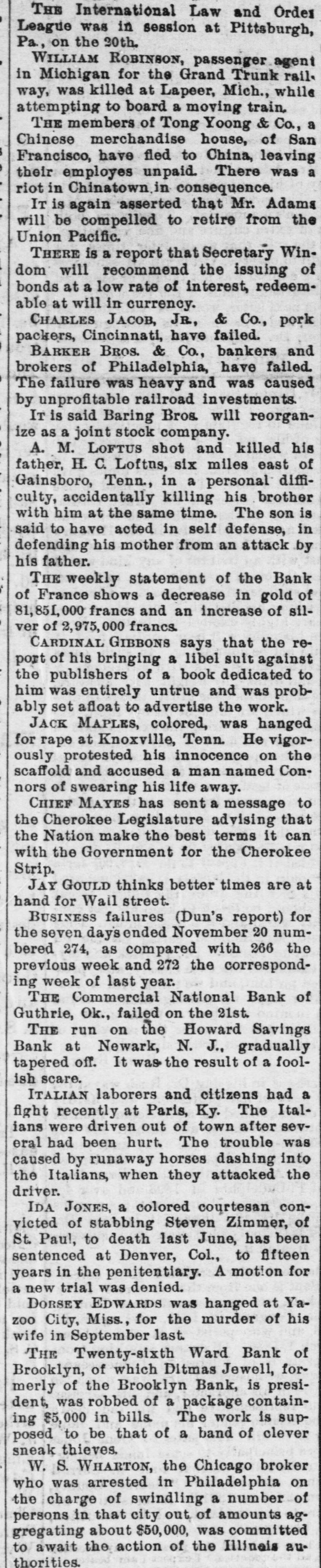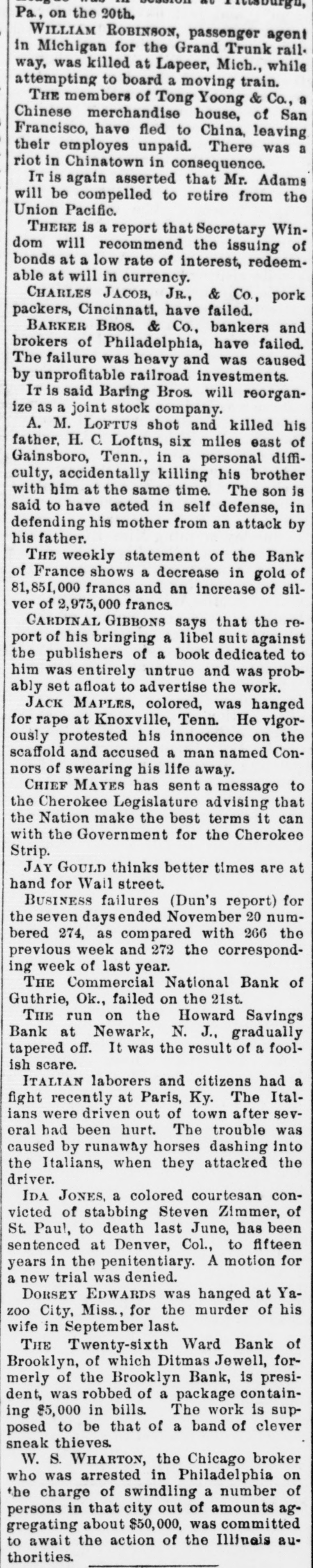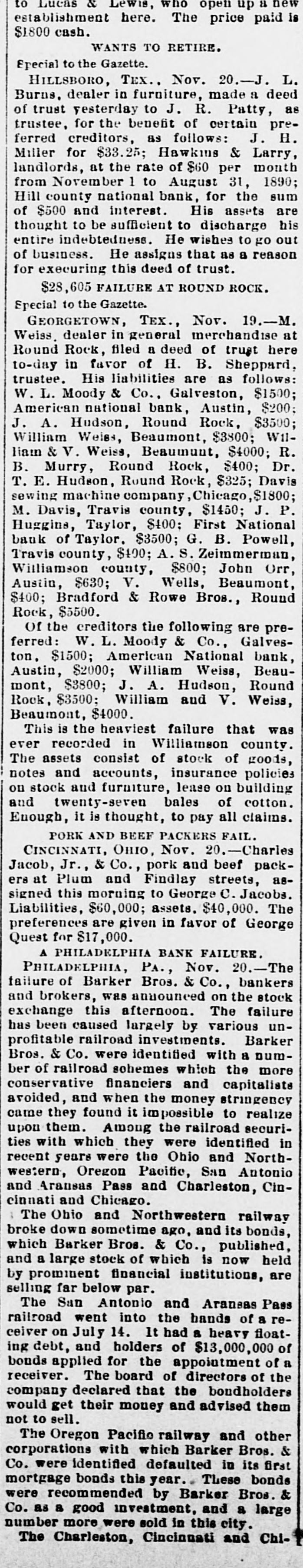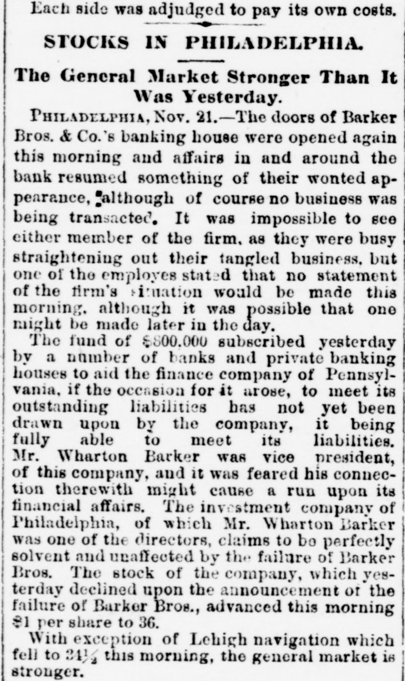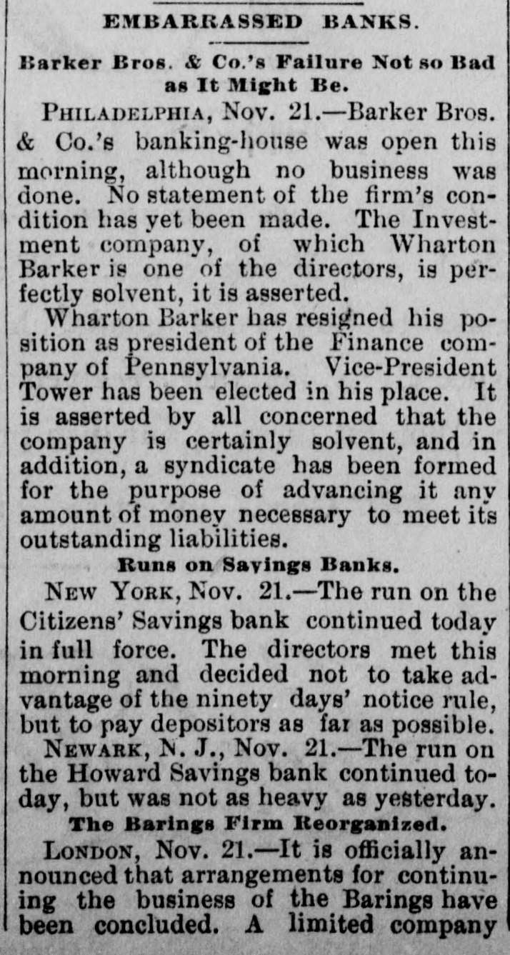The Barker Bros. & Co. Failure-Well Known Financiers. PHILADELPHIA. Nov. 20.-Abraham Barker, founder of Barker Broe. & Co., bankere and brokers, who failed today, was one of the best financiers in the country and was formerly president of the Stock Exchrage. Wharton Barker. another member of the firm said this afternoon: "The assignment was unavoidable, as the people who owed us money. upon whom we depended, did not pay us. Of course the condition of the money market has much to do with the trouble. The step was necessary for the protection of our customers." The first matter which brought the house prominently before the general public was the announcement in 1877-78 that they had become financial agents for the Russian government in the United States. This mission was at that time highly important in view of a war between England and Russia, which then seemed imminent. In carrying out the instructions of the Russian government, Barker Bros. & Co. procured four ships of war, suitable ordinance, and completely armed and equipped them. The total expenditure amounted to several millions dollars the whole transaction was consumated to the utmost satisfaction of Russia. Wharton Barker, president of the finance company in Pennsylvania, was director of a finance company in Philadelphia, of which he was formerly vice president. At the finance company preparations were made for an anticipated run on deposits and a number of checks presented during the last hour of the day's business and some accounts drawn out. All drafts were promptly met, and Treasurer Stearns assured a number of persons who had an account there, that the company was entirely sol vent, and would pay everything presented in form of check or other demands. Failure Barker Bros. & Co., was caused largely by various unprofitable investments. They were identified with a number of railroad schemes which prudent financiers and capitalists avoided when the money stringency came found it impossible to realize upon them. A syndicate consisting of Drexel & Co., Brown Bros, & Co., Provident and Trust Co. and Pennsylvania Co. for the insurance of lives and granting of annuities has been formed for the purpose of advancing to the finance in the State of Pennsylvania any amount of money that may be necessary to meet outetanding liabilities. It is asserted that the company is certainly solvent and with the assistance of the syndicate will be able to tide over the crisis in its affairs caused by the failure of Barker.