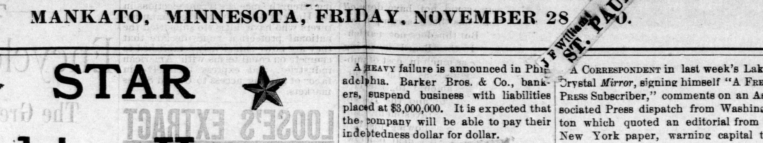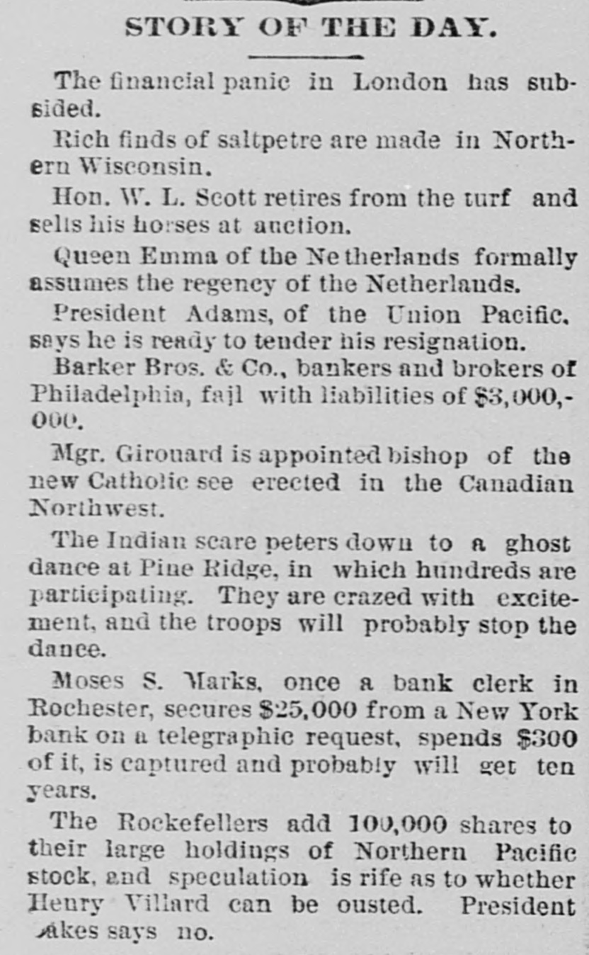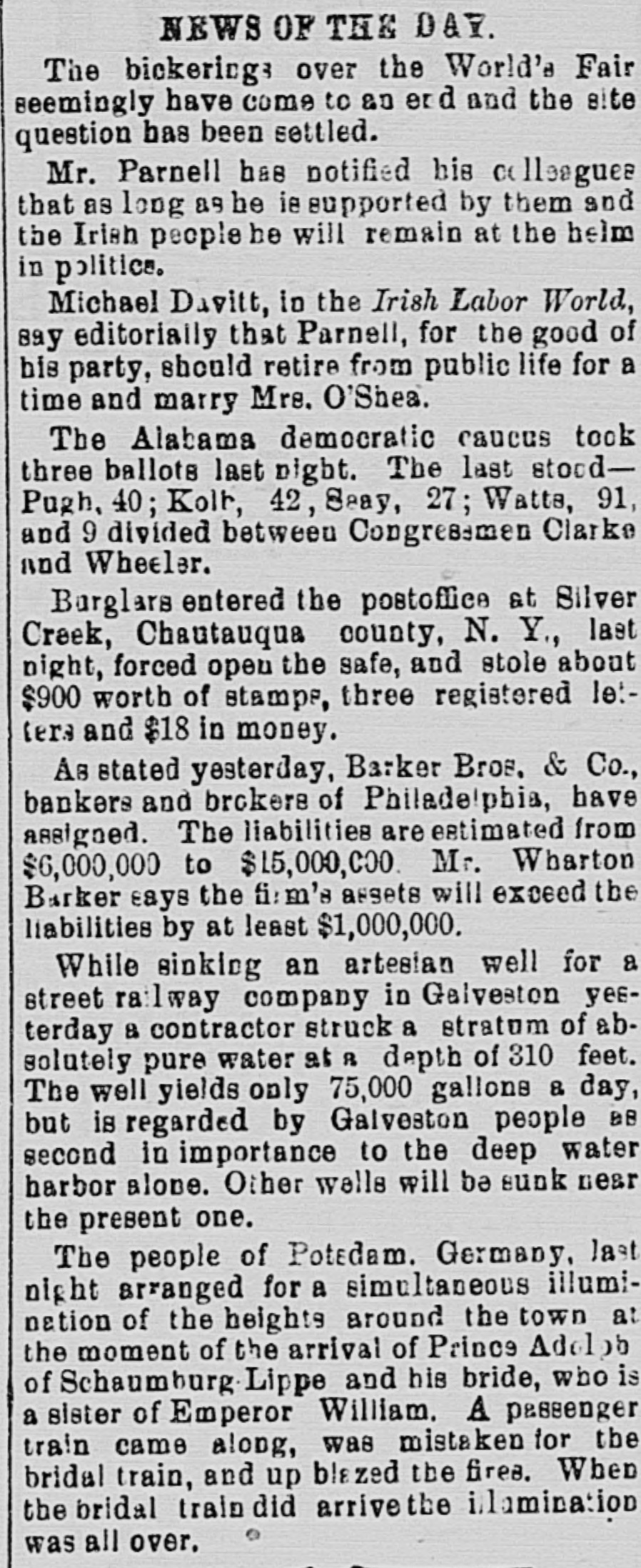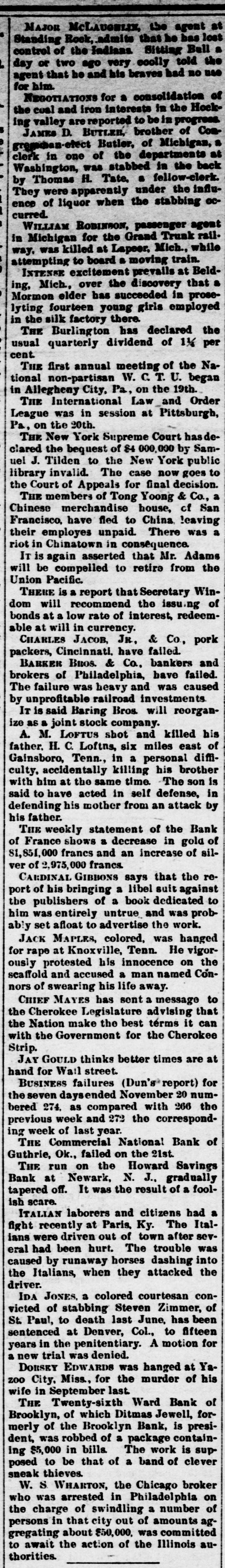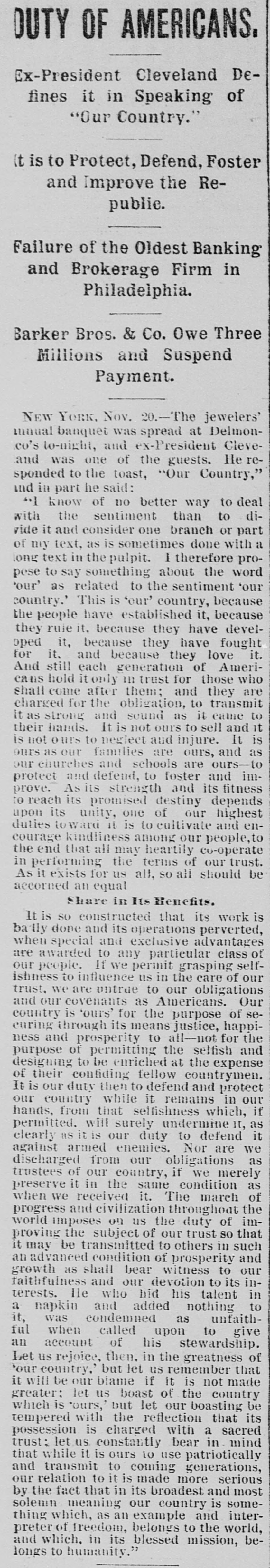 The Barker Bros. & Co. Failure-Well Known Financiers. PHILADELPHIA. Nov. 20.-Abraham Barker, founder of Barker Broe. & Co., bankere and brokers, who failed today, was one of the best financiers in the country and was formerly president of the Stock Exchrage. Wharton Barker. another member of the firm said this afternoon: "The assignment was unavoidable, as the people who owed us money. upon whom we depended, did not pay us. Of course the condition of the money market has much to do with the trouble. The step was necessary for the protection of our customers." The first matter which brought the house prominently before the general public was the announcement in 1877-78 that they had become financial agents for the Russian government in the United States. This mission was at that time highly important in view of a war between England and Russia, which then seemed imminent. In carrying out the instructions of the Russian government, Barker Bros. & Co. procured four ships of war, suitable ordinance, and completely armed and equipped them. The total expenditure amounted to several millions dollars the whole transaction was consumated to the utmost satisfaction of Russia. Wharton Barker, president of the finance company in Pennsylvania, was director of a finance company in Philadelphia, of which he was formerly vice president. At the finance company preparations were made for an anticipated run on deposits and a number of checks presented during the last hour of the day's business and some accounts drawn out. All drafts were promptly met, and Treasurer Stearns assured a number of persons who had an account there, that the company was entirely sol vent, and would pay everything presented in form of check or other demands. Failure Barker Bros. & Co., was caused largely by various unprofitable investments. They were identified with a number of railroad schemes which prudent financiers and capitalists avoided when the money stringency came found it impossible to realize upon them. A syndicate consisting of Drexel & Co., Brown Bros, & Co., Provident and Trust Co. and Pennsylvania Co. for the insurance of lives and granting of annuities has been formed for the purpose of advancing to the finance in the State of Pennsylvania any amount of money that may be necessary to meet outetanding liabilities. It is asserted that the company is certainly solvent and with the assistance of the syndicate will be able to tide over the crisis in its affairs caused by the failure of Barker.