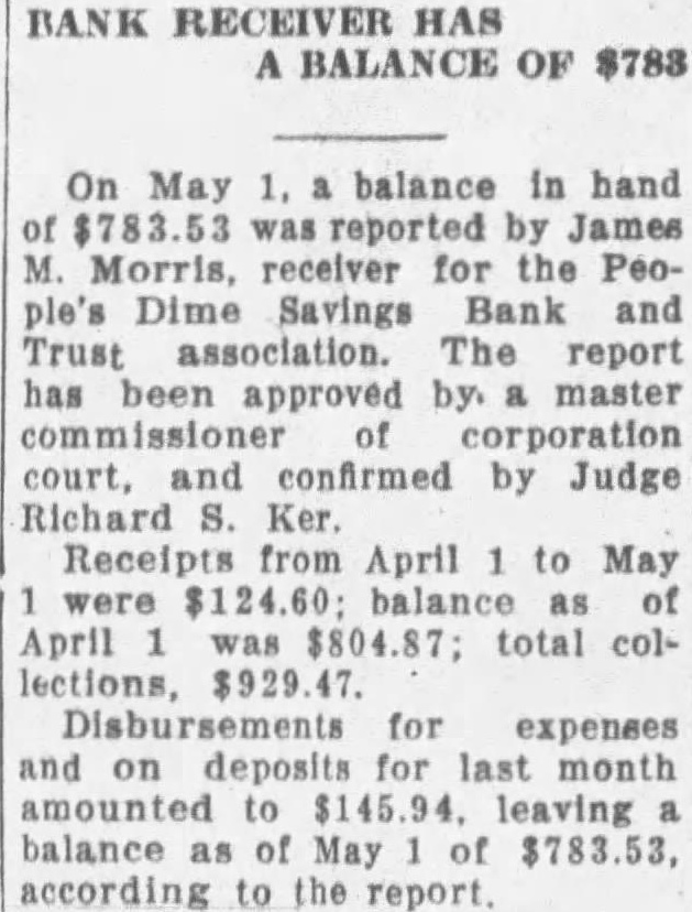 BANK RECEIVER HAS BALANCE OF On May balance in hand reported by James Morris, receiver for the People's Dime Savings Bank and Trust association. The report has been approved by. master corporation court, and confirmed by Judge Richard Ker. Receipts from April to May were balance of April was $804.87; total col$929.47. Disbursements for expenses and deposits for last month amounted to leaving balance of May of $783.53, according to the report.
