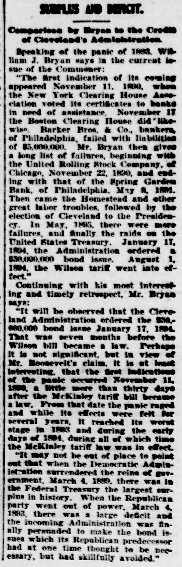 SUBPLUS N BRAT. Comparison by Mryaa w the Cream of Clovdand's remisteration Speaking of the panic of 1893. ww liam J. Bryan says in the current w sue of the Commoner: "The first indication of its coming appeared November 11. 1830, when the New York Clearing House sam ciation voted its certificates to banks in need of assistance. November 18 the Boxton Clearing House did'llkowise. Barker Bros. & Co., bankers of Philadelphia, failed with liabilities of $5,000,000. Mr. Bryan then gives a long list of failures, beginning with the United Rolling Stock Company, of Chicago, November 22, 1830, and ending with that of the Spring Garden Bank, of Philadelphia, May 8. 1801. Then came the Homestead and other great labor troubles. followed by the election of Cleveland to the Presidency. In May. 1893. there were more failures, and finally the raids on the United States Treasury. January 17. 1894. the Administration ordered s $30,000,000 bond issue. August 1, 1894. the Wilson tariff went into offect." Continuing with his most interest ing and timely retrespect, Mr. Bryan says: "It will be observed that the Clere land Administration ordered the sre.000,000 bond issue January 17, 1894. That was seven months before the Wilson bill became a law. Perhape It is not significant, but in view of Mr. Roosevelt's claim. it is at least Interesting. that the first Indications occured nette more of 1800, the a pasic than November thirty days 11. after the McKinley tariff bill became a law. From that date the panic raged and while its effects were felt for several years, it reached its worst stage in 1883 and during the early days of 1894. during all of which time the McKinley tariff law was in effect. "It may not be out of place to point out that when the Democratic Administration surrendered the reins of gevernment. March 4. 1889. there was is the Federal Treasury the largest surplus in history. When the Republican party went out of power. March 4. 1893. there was a large deficit and the incoming Administration was finally persoaded to make the bond issues which its Republican predecessor had at one time thought to be necessary, but had skillfully avoided."