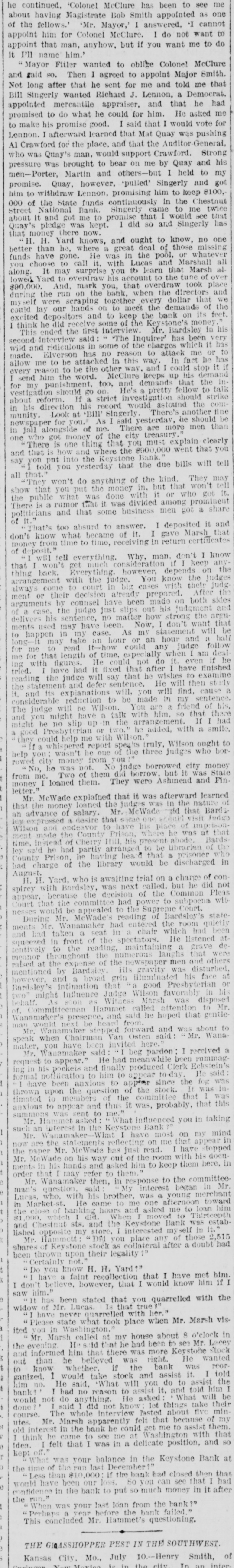 he continued. Colonel McClure has been to see me about having Magistrate Bob Smith appointed as one of the fellow Mr. Mayor, I answered, I cannot appoint him for Colonel McClure. I do not want to appoint that man, anyhow, but if you want me to do It I'll name him. Mayor Fitler wanted to oblike Colonel McClure Then I agreed to appoint Major Smith that he sent for me and wanted Richard J. Lennon, and Not Bill said Singerly long so. after that told Democrat. he me that had appointed mercantile appraiser, and promised to do what he could for him. He asked me to make his promise good. said that would vote for Lennon. afterward learned that Mat Quay was pushing Crawford for the place. and that the Auditor General who was Quay's man, would support Crawf rd. Strong pressure was brought to bear on me by Quay and his men- Porter, Martin and others- but I held to my Quay, however, +pulled Singerly and got to promise. withdraw Lennon, promising him to keep $100, came 000 him of the State funds continuously In the me Chestnut twice it me about got and Street National Bank. to promise that would see that has and did Singerly so was kept. Quay's pledge there now H. that money Yard knows, and ought to know, no one deal those of great better than he, where pool, or whatev call with to it. funds have gone. He was in Lucas the and Marshall choose may surprise you to learn that Marsh Yard along. account to the tune mark you, that overdraw took the bank. the run $90,000. And when the directors during that dollar every together our scraping hands on to meet the demands of and to keep the bank on of some the first the ended think he did interview Mr. Bardsley has been said The Inquirer' in ridiculous second some the charges which to no reason attack has Elverson made. In this in way attacked to be allow way. the other be the him to word McClure keeps up the and demand too. should unishment go He's pretty fellow to should investip strict reform astound the would record his direct in his another There' Singerly BIII at Look munity should he resterday said than men are There more me of alongside treasury of the city you must explain clearly where the There is one thing that $000,000 went that Bank yesterday told say the that the due bills will tell but all do anything of the kind that They in money that who rumor that it was divided among promine men got business some that and of it and deposited I answer. to absurd too gave Marsh became don't know time what to time, receiving in return know I man don't Why, keep that depends the know both strong want don't Now will As and hour judge any have after wishes He find. will made be that with him talk If with Wilson me truly Wilson ought to report who bor judges three the money city borrowed judge of them did borrow but it was from loaned Two them. They were Ashmead and Fin the Mr McWade explained that it was afterward the na learned Bard std that MeWade Mr. advance salary. partly of the library would be discharged of a charge on trial is awaiting who Yard. did but he the Bardsley room the which He that and Mr. received since the the that probably taking in you hat influenced his room in here, them to keep committee the to began Bank 2.510 had doubt after legality been H H. Yard faint recollection that I have met him. if however, that I would know him him been stated that you quarrelled with the true Lucas that Mr quarrelled with her. state what took place when Mr. Marsh vis ited M Marsh my house about 8 o'clock Lacey in at he had been to se Mr. stock He the informed him there was more Keyston wanted right. was believed was bank the if whether to it. assist and stock take would ganized assist do to will you What He him told it. reason will He asked take things about Pasted whole Mr. Marsh apparently felt that because assist bank he could Washington me to with think felt that was in a delicate position, and balance in the Keystone Bank at can the bank had closed that then that bank to put SO much money in it afte in last loan from the falled. bank before the bank This concluded Mr. Hammet's questioning. THE GLASSHOPPER PEST IN THE SOUTHWEST of Kansas City, Mo. July 10.--Henry Smith city.