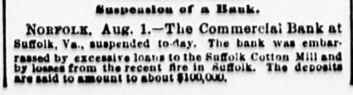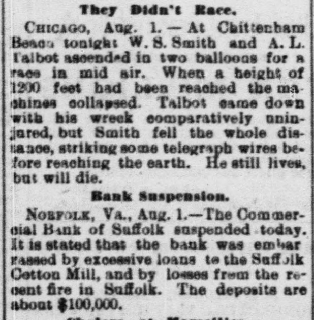 NEWS IN BRIEF. Baltimore, Md., August 1.-It is stated that the Western Union Telegraph Company obtained a temporary injunction in Harrisburg to-day restraining the Balti more and Ohio Telegraph Company from entering that city. New York, August 1.-Judge Cullen today, in the Supreme Court, rendered a decision in the case of the Gypsies who were brought here ou a steamer of the Bordeaux line, by which they will be compelled to return to France. New Orleans, August 1.-P.S. Colby, paymaster of Morgan's Louisiana and Texas Railroad and Steamship Company, was arrested here this morning on a charge of embezzlement. The amount of shortage is over $11,000. Norfolk, Va., August 1.-The Commercial Bank of Suffolk suspended to-day. It is stated that the bank was embarrassed by excessive loans to the Suffolk Cott on Mill and by losses from the recent fire in Suffolk. The deposits are about $100,000. Massillon, o., August 1.-All be n.iners, about 1200 in number, employed in the Massillon district, Tuscaraw S Valley, stopped work to-day owing to tha demand of the operators that they accept a reduction of 75 to 60 cents per ton in price of mining. Philadelphia, Pa., August 1.-A special to the Press from Hamilon, says: "In accordance with an act of the Legislature prohibiting the employment of boys under twelve years old in the coal breakers, and under fourteen in the mines, about 500 boys will be discharged from the collieries in this vicinity to-day. e Pittsburg, Pa., August 1.-No doublee header trains were sent out by the Baltie more and Ohio railroad to-day, and the r, str kers still remain firm. Superintendent e Harris met the men this morning, but e they declined to yie Id. He says the comk pany proposes to run their trains to suit W themselves, and anticipates no disorder. e Chicago, August 1.-The three Italian le stranglers, Azar, Gelardi and Silvester, 8 lately sentenced to be banged for the mur 's der of Filippo Carttso, appeared in Judge h Haxes's court-room to-day while their re a d for a new wa is the commencement spective of granted, the motion attorneys asked for trial. continuance of This the Sep tember term being set for argumenton the 1. motion. Philadelphia, Pa, August 1.-Gov. Pat et tison presided at a meeting here to-day t as raise $7000 to help build a chapel for th rt University of Virginia. Several speeche y, were made in which it was stated that th rproposed constitution would be taken a g an evidence of the increasing fraterna d feeling between the people South an d North. A committee for the purpose wa ch appointed. be