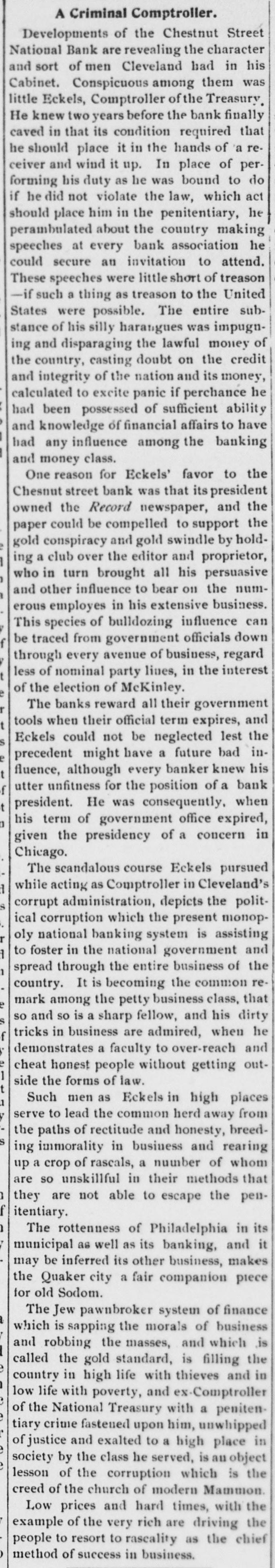 # A Criminal Comptroller. Developments of the Chestnut Street National Bank are revealing the character and sort of men Cleveland had in his Cabinet. Conspicuous among them was little Eckels, Comptroller of the Treasury. He knew two years before the bank finally caved in that its condition required that he should place it in the hands of a receiver and wind it up. In place of performing his duty as he was bound to do if he did not violate the law, which act should place him in the penitentiary, he perambulated about the country making speeches at every bank association he could secure an invitation to attend. These speeches were little short of treason - if such a thing as treason to the United States were possible. The entire substance of his silly harangues was impugning and disparaging the lawful money of the country, casting doubt on the credit and integrity of the nation and its money, calculated to excite panic if perchance he had been possessed of sufficient ability and knowledge of financial affairs to have had any influence among the banking and money class. One reason for Eckels' favor to the Chesnut street bank was that its president owned the *Record* newspaper, and the paper could be compelled to support the gold conspiracy and gold swindle by holding a club over the editor and proprietor, who in turn brought all his persuasive and other influence to bear on the numerous employes in his extensive business. This species of bulldozing influence can be traced from government officials down through every avenue of business, regardless of nominal party lines, in the interest of the election of McKinley. The banks reward all their government tools when their official term expires, and Eckels could not be neglected lest the precedent might have a future bad influence, although every banker knew his utter unfitness for the position of a bank president. He was consequently, when his term of government office expired, given the presidency of a concern in Chicago. The scandalous course Eckels pursued while acting as Comptroller in Cleveland's corrupt administration, depicts the political corruption which the present monopoly national banking system is assisting to foster in the national government and spread through the entire business of the country. It is becoming the common remark among the petty business class, that so and so is a sharp fellow, and his dirty tricks in business are admired, when he demonstrates a faculty to over-reach and cheat honest people without getting outside the forms of law. Such men as Eckels in high places serve to lead the common herd away from the paths of rectitude and honesty, breeding immorality in business and rearing up a crop of rascals, a number of whom are so unskillful in their methods that they are not able to escape the penitentiary. The rottenness of Philadelphia in its municipal as well as its banking, and it may be inferred its other business, makes the Quaker city a fair companion piece for old Sodom. The Jew pawnbroker system of finance which is sapping the morals of business and robbing the masses, and which is called the gold standard, is filling the country in high life with thieves and in low life with poverty, and ex-Comptroller of the National Treasury with a penitentiary crime fastened upon him, unwhipped of justice and exalted to a high place in society by the class he served, is an object lesson of the corruption which is the creed of the church of modern Mammon. Low prices and hard times, with the example of the very rich are driving the people to resort to rascality as the chief method of success in business.