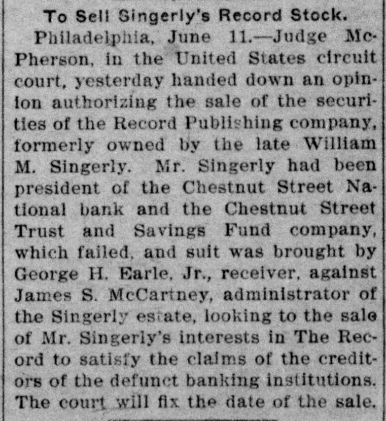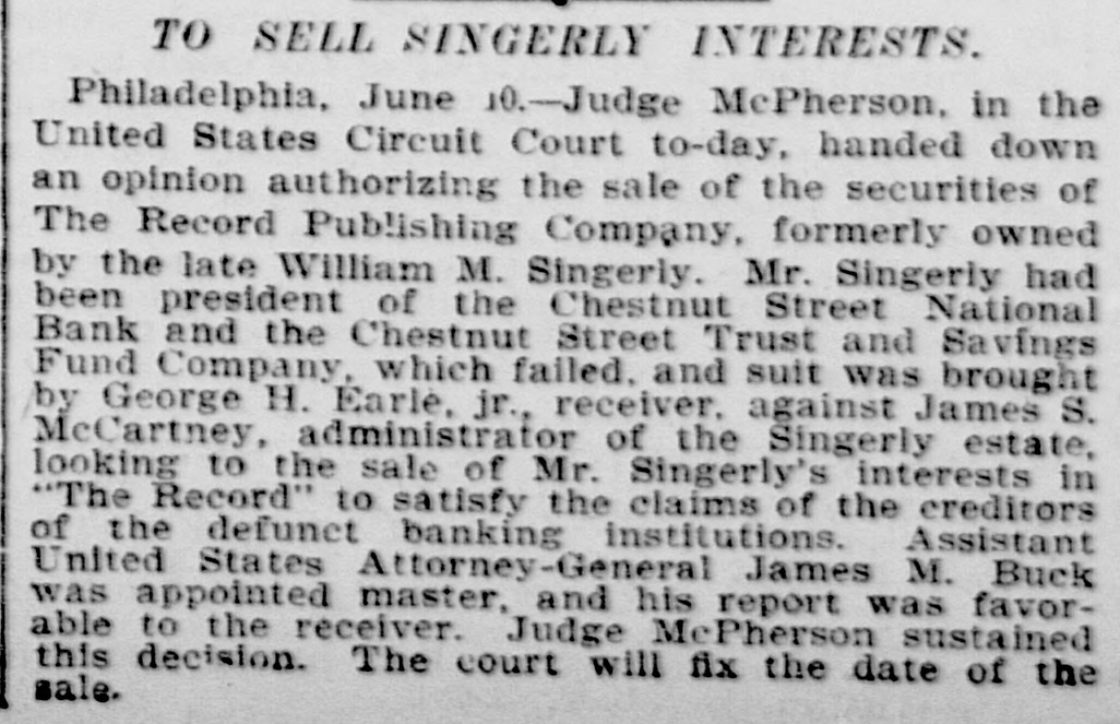 TO SELL SINGERLY INTERESTS. Philadelphia, June 10.-Judge McPherson, in the United States Circuit Court to-day, handed down an opinion authorizing the sale of the securities of The Record Publishing Company, formerly owned by the late William M. Singerly. Mr. Singerly had been president of the Chestnut Street National Bank and the Chestnut Street Trust and Savings Fund Company, which failed. and suit was brought by George H. Earle, jr., receiver. against James S. McCartney, administrator of the Singerly estate, looking to the sale of Mr. Singerly's interests in "The Record" to satisfy the claims of the creditors of the defunct banking institutions. Assistant United States Attorney-General James M. Buck was appointed master, and his report was favorable to the receiver. Judge McPherson sustained this decision. The court will fix the date of the sale.