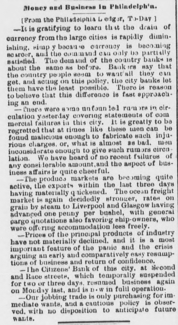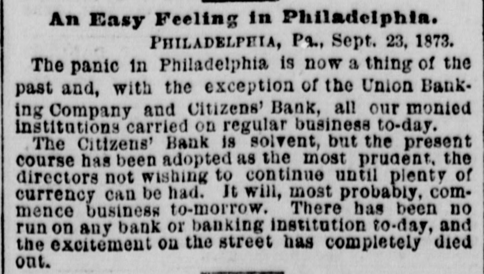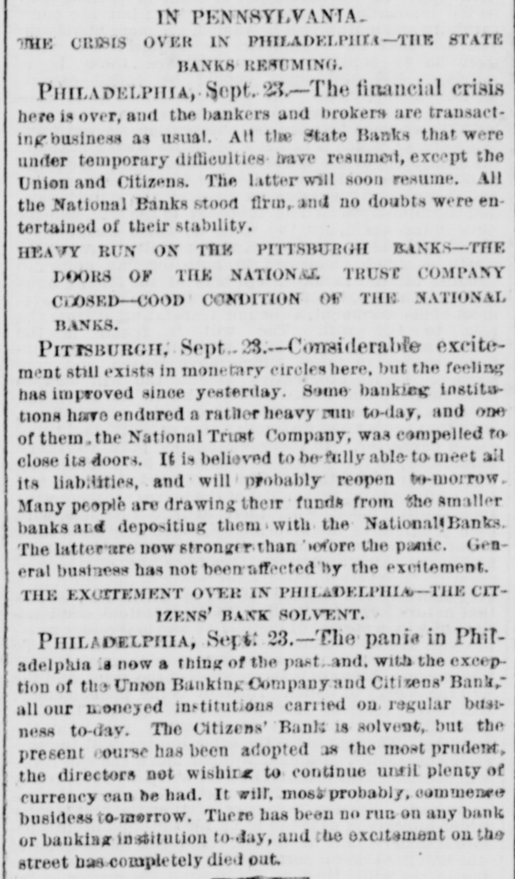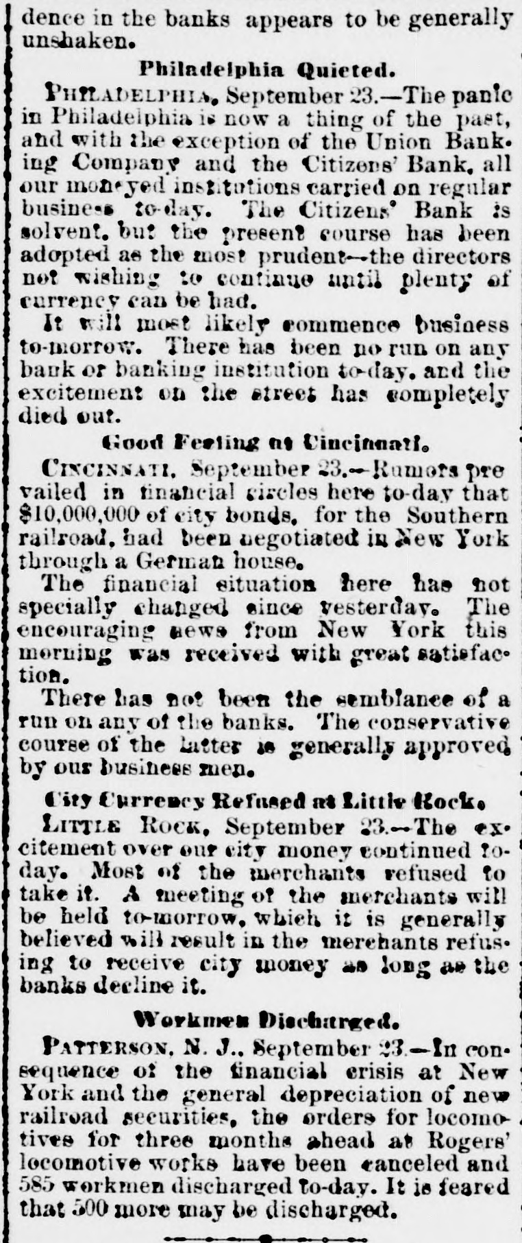 resultion he vielded to the clamor that mistake, beset him. and the would have made been nationalized instead narrow limits. panic of being would concentrated have within the Bonds Bought. $83,333.3 The total amount of bonds bought at the sub-treasury Evening Items. that the statement on Saturday Bank had been The of the Continental House was in thrown checks out at the Clearing confounded with The the error. it having been Commonwealth Continental National Bank Bank if the is and has been paying bonds as usual. Three million dollars in to this P.M by the sub- Treasurer up the bought hour. and more coming in at the suit of Judge National Fancher Bank, to-day. of this the city, property grant of the Union $10,000. ed Grocers' an attachment National Bank, against of Philadelphia, in this city for Co. overdrew their acA. D. Williams Bank & of North America te decount in the $450,000. To-day the still firm due an amount posited $250,000, of leaving are $200,000 now engaged in that sum. The endeavor bank authorities to compel the payment of Bank Failures.E of the National tion The executive committee concluded their investiga this at the found Trust of Company the affairs of the securities institution all corof the reet. ternoon. They and report sound, the condition and their keep- notify all accounted Company depositors perfectly that the funds for left to the in last dollar ing will total be assets are $5,350,000. loan certificates The Many bankers thick issued earlier, but should have this. been with the purchase greatly in of bonds agree the that government, has aided that there was no ter. New storing by confidence. apprehension and of further disas- this 97. for ground for York Central stock sold dividend, Bank afternoch. The report ex of the instability of a of number the of the customers to returning of North America of A. grew D. out Williams & that Co., firm on Saturday evening checks on the Bank of fright- North their certified Williams & Co. became account good America. failed to make their their securities. as that by ened turning and into has the been bank stated, in the bank reThis resulted. ports of heavy over-drafts attachment upon upon will and their taking one It is an stated this trouble Williams amicably & Co. arranged very soon. his -night be What Jay Gould Thinks. opinion Jay Gould safety expressed for the mercantile general com that the only general public is in the munity suspension and of the banks. From Milwaukee. the A diepatch from Milwaukee adjourned says until Wednesday Chamber of on Commerce account of the state of affairs. Action of the Government. September 22.-President Grant is at reasserts the security Jav WASHING Cooke Willards. of the London of the morning In the called house. course at the Treasury Secretary Department the Presi- Richdent and had a conference with ardson. result of it may be inferred Secretary from The that New the York Assostated the fact to the agent the of President the will do any ciated within Press that the law. but authority; in no particular he will the maintain the credit go thing beyond clear safety legal of the Treasury of De- the partment States and from protect the influences of general curfinancial United abarrassments. amount of will be a sufficient belonging to rency There in New York to to-morrow buy all the bonds of that the the go vernment offered The Secretary and will may be all that is necessary, hands Treasury out that has there is enough to in buy the every in the thing for sale. Judge of look the assistant shape treasurer of governmet Richard- bonds that is presented he will see that law, the government ard that he son does says its exactly duty within where the to get not, all the however, funds knows necessary He does talked that are word about the much part of the money intimate a reserve furnishing a treasurer at legal tender to go to the assistant New York. Department denies that the The Treasury fund has been transferred banks navy from Jay account Cooke, Mo Washington Culloch & savings Co. The run on comparatively the very slight. o-day was Richardson received the follow Secretary dispatch dated New York, as to-day usual ng Mercantile business progresses itself. The people Wall street is atulations already to the President stability. and oin in conj for their The cretary Stock Richardson Exchange will be opened on Wednesday Rock Banks Endeavor to CreThe Little ate a Panic. panic LITTLE Rock. September North, 22 the On banks account here f o-day the financial refused to take city money, circulation home at currency, which has and been as in a consequence ar for six years. prevailed. This money reat asalways excitement been received the same as greenacks. citizens' meeting was held in to the take after- the A which it was resolved impression is onn. at usual. The general to-morrow, honey as panic will be over by usual. nd hat the the money will be taken as Philadeiphia All Right. September There to-day. was III PHILADELPHIA, better feeling on the street & Co. much excitement in London- Jay Cooke Continue to Pay 22, Cash. 5 M.-Much LONDON. manifested September on all sides to Cooke, hear ixiety is from New York. Jay cash in rther eCulloch news & Co. continue over their to pay counter. to usual the manner rumors current in the England Stock mong one that the Bank of of rehange of Jay Cooke & Co. accept nces and that olde $300,000 Rathschilds has $100,000 of un same paper. M.-A dispatch announcing the 5:30 P. of the New York Gold Exchange 18 acosing been bulletined. This news is s just an indication of the gravity for of pted as situation. and the market merican e financial securities 18 again depressed. Cincinnati Feels Confident. 2.-The feeling for ma men CINCINNATI, confidence September which has prevaile during here mong financial and the trouble business in New York is e continued progress, of throughout to-day. have Applica- been ou the banks for discounts from the ha ons at light. and orders less than i