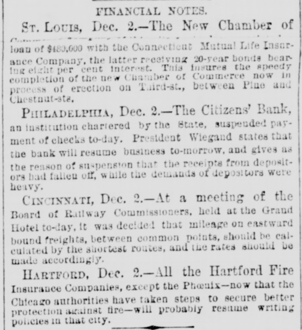 FINANCIAL NOTES. ST. LOUIS, Dec. 2.-The New Chamber of loan of $480,000 with the Connecticut Mutual Life Insurance Company. the latter receiving 20-year bonds bear ing eight per cent interest. This insures the speedy completion of the ne Chamber of Commerce now in process of erection on Third-st., between Plue and Chestnut-sta. PHILADELPHIA, Dec. 2.-The Citizens' Bank, an institution chartered by the State, suspended payment of checks to-day. President Wiegand states that the bank will resume business to-morrow, and gives as the reason of suspension that the receipts from depositors had fallen off, while the demands of depositors were heavy. CINCINNATI, Dec. 2.-At a meeting of the Board of Railway Commissioners, held at the Grand Hotel to-day, it was decided that mileage on eastward bound freights. between common points, should be calculated by the shortest routes, and the rates should be made accordingly. HARTFORD, Dec. 2.-All the Hartford Fire Insurance Companies, except the Phenix-now that the Chicago authorities have taken steps to secure better protection against fire-will probably resture writing policies in that city.
