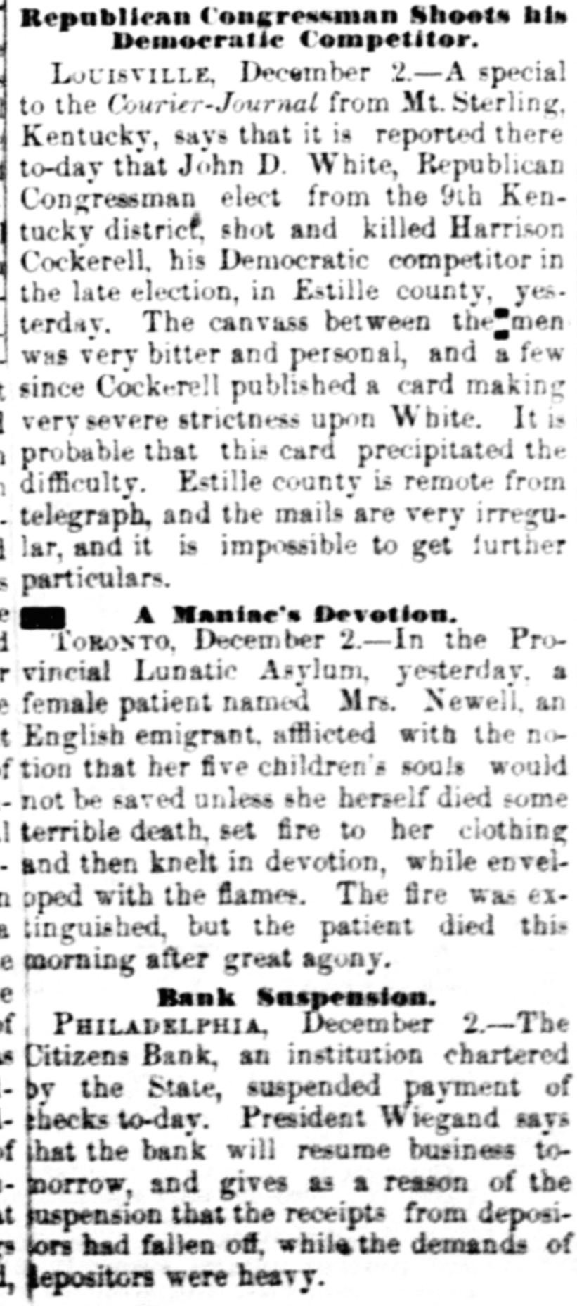 Republican Congressman Shoots his Democratic Competitor. LOUISVILLE, December 2. - A special to the Courier-Journal from Mt. Sterling, Kentucky, says that it is reported there to-day that John D. White, Republican Congressman elect from the 9th Kentucky district, shot and killed Harrison Cockerell, his Democratic competitor in the late election, in Estille county, yes. terday. The canvass between the men was very bitter and personal, and a few since Cockerell published a card making very severe strictness upon White. It is probable that this card precipitated the difficulty. Estille county is remote from telegraph, and the mails are very irregular, and it is impossible to get further particulars. A Maniac's Devotion. TORONTO. December 2.-In the Provincial Lunatic Asylum, yesterday. a female patient named Mrs. Newell. an t English emigrant. afflicted with the noif tion that her five children's souls would - not be saved unless she herself died some I terrible death, set fire to her clothing and then knelt in devotion, while envelh oped with the flames. The fire was exa tinguished, but the patient died this e morning after great agony. e Bank Suspension. of PHILADELPHIA. December 2. - -The is Citizens Bank, an institution chartered - by the State, suspended payment of thecks to-day. President Wiegand says of that the bank will resume business tomorrow, and gives as a reason of the juspension that the receipts from deposilors had fallen off, while the demands of 1, depositors were heavy.