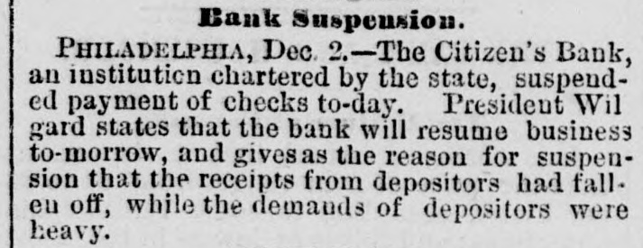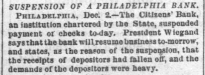 SUSPENSION OF 4 PHILADELPHIA BANK. Philadelphia, Dec. 2-The Citizens' Bank, an institution chartered by the State, suspended payment of checks to-day. Prestdent W legand says saysthat that the bank will resume business to-morrow, and states, as the reason of the suspension, that the receipts of depositors had fallen off, and the demands of the depositors were heavy.