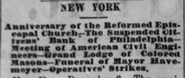 Anniversary of the Reformed Episcopal Church-The Suspended Citizens' Bank of Philadelphia-Meeting of American Civil Engineers-Grand Lodge of Colored Masons-Funeral of Mayor Havemeyer-Operatives' Strikes.