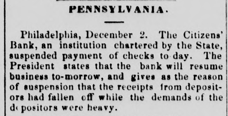 PENNSYLVANIA. I Philadelphia, December 2. The Citizens' Bank, an institution chartered by the State, suspended payment of checks to day. The President states that the bank will resume business to-morrow, and gives as the reason of suspension that the receipts from depositors had fallen off while the demands of the de positors were heavy.