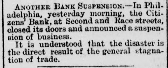 ANOTHER BANK SUSPENSION.-In - Philadelphia, yesterday morning, the Citizens' Bank, at Second and Race streets, closed its doors and announced a suspension of business. It is understood that the disaster is the direct result of the general stagnation of trade.