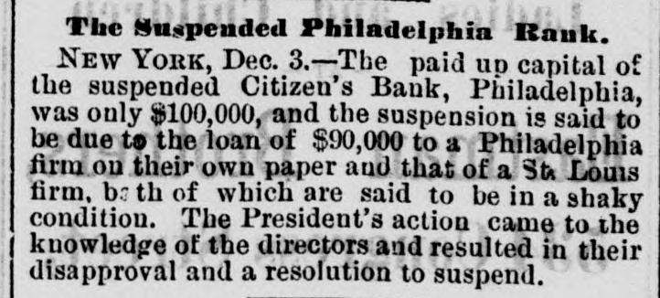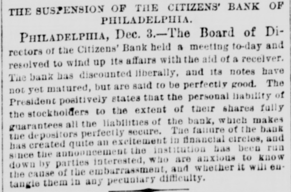 THE SUSPENSION OF THE CITIZENS' BANK OF PHILADELPHIA. PHILADELPHIA, Dec. 3.-The Board of Directors of the Citizens' Bank held a meeting to-day and resolved to wind up its affairs with the aid of a receiver. The bank has discounted liberally, and its notes have not yet matured, but are said to be perfectly good. The President positively states that the personal liability of the stockholders to the extent of their shares fully guarantees all the liabilities of the bank, which makes the depositors perfectly secure. The failure of the bank created quite an excitement in financial circles, and has has been run since the announcement the institution down by parties interested, who are anxious to know the cause of the embarrassment, and whether it will eutangle them in any pecuniary difficulty.