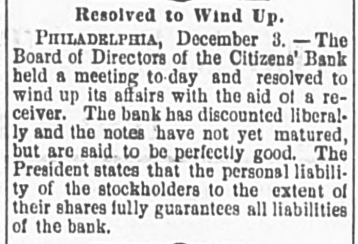 Resolved to Wind Up. PHILADELPHIA, December 3. - The Board of Directors of the Citizens' Bank held a meeting today and resolved to wind up its affairs with the aid of a receiver. The bank has discounted liberally and the notes have not yet matured, but are said. to be perfectly good. The President states that the personal liability of the stockholders to the extent of their shares fully guarantees all liabilities of the bank.