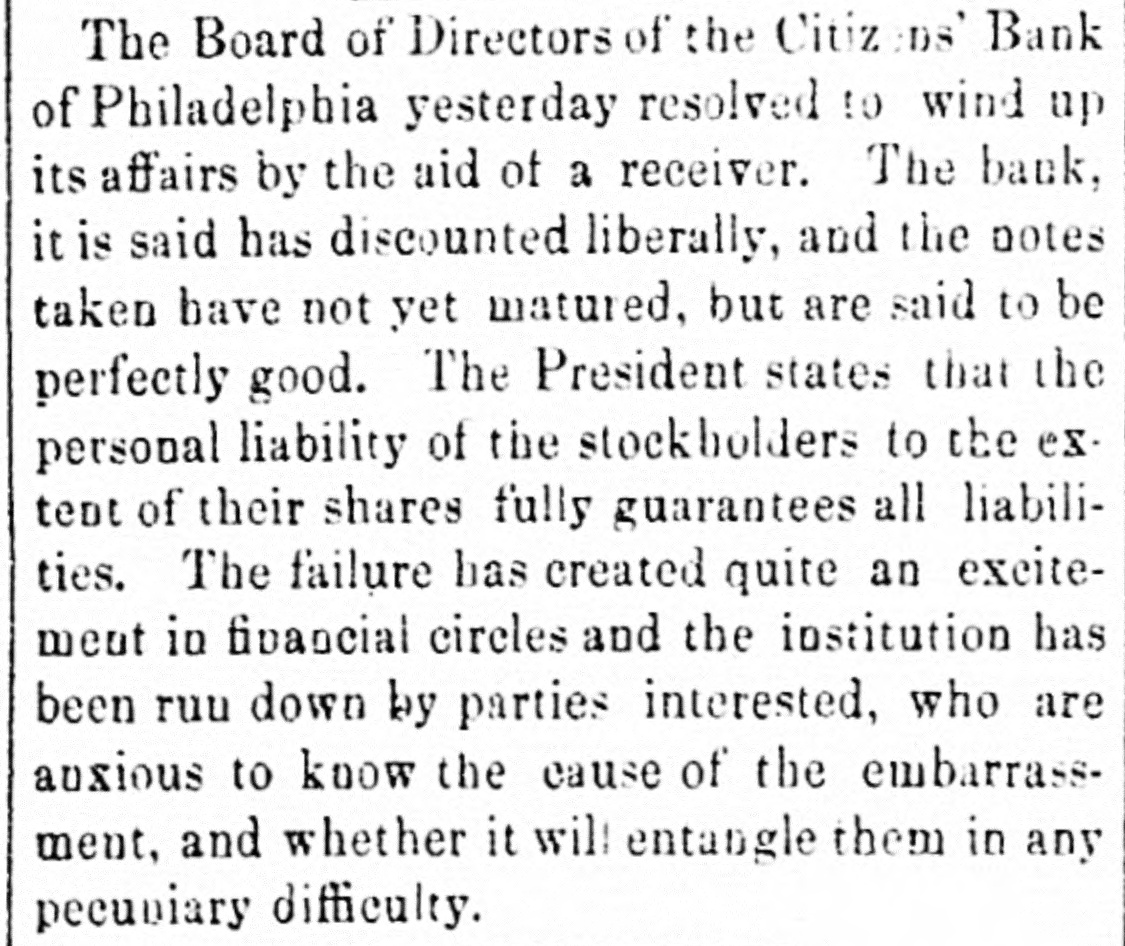 The Board of Directors of the Citiz ins' Bank of Philadelphia yesterday resolved to wind up its affairs by the aid of a receiver. The bank, it is said has discounted liberally, and the notes taken have not yet matured, but are said to be perfectly good. The President states that the personal liability of the stockbolders to the extent of their shares fully guarantees all liabilities. The failure has created quite an excitement in financial circles and the institution has been ruu down by parties interested, who are auxious to know the cause of the embarrassment, and whether it will entangle them in any pecuniary difficulty.
