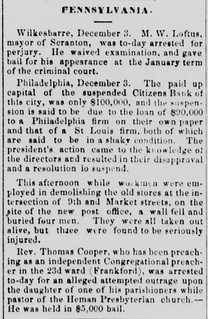 FENNSYLVANIA. Wilkesbarre, December 3. M. W. Leftus, mayor of Scranton, was to-day arrested for perjury. He waived examination, and gave bail for his appearance at the January term of the criminal court. Philadelphia, December 3. The paid up capital of the suspended Citizens Bank of this city, was only $100,000, and the suspension is said to be due to the loan of $90,000 to a Philadelphia firm on their own paper and that of a St Louis firm, both of which are said to be in a shaky condition. The president's action came to the knowledge of the directors and resulted in their disapproval and a resolution io suspend. This afternoon while workmen were employed in demolishing the old stores at the intersection of 9th and Market streets, on the site of the new post office, a wall fell and buried feur men. They were all taken out alive, but three were found to be seriously injured. Rev. Thomas Cooper, who has been preaching as an independent Congregational preacher in the 23d ward (Frankford), was arrested to-day for an alleged attempted outrage upon the daughter of one of his parishioners while pastor of the Heman Presbyterian church.He was held in $5,000 bail.