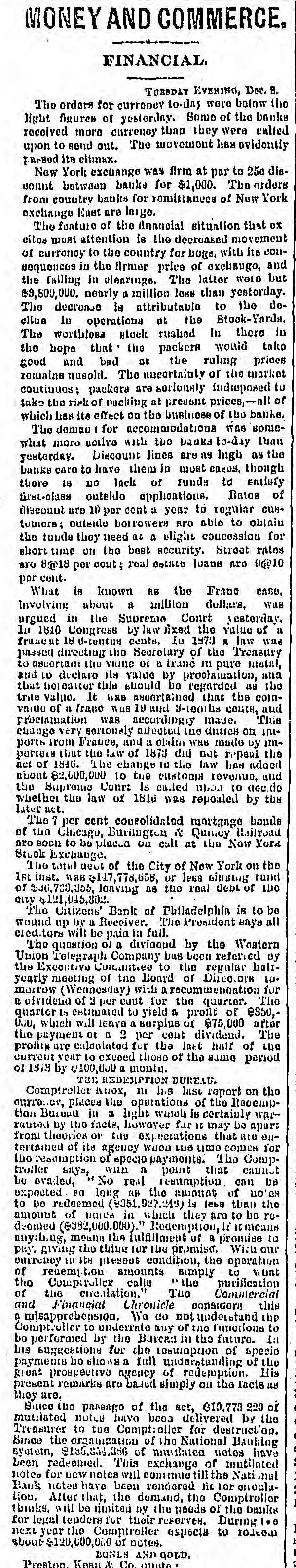 MONEY AND COMMERC FINANCIAL. TURSDAY EVENING, Dec. The orders for currency to-day wore below light figures of yesterday. Some of the ba received more currency than they were ca upon to send out. The movement has evido parsed its climax. New York exchange was firm at par to 25c count between banks for $1,000. The ord from country banks for remittances of Now x exchange East are large. The funture of the Anancial situation that cites most attention is the decreased movem of currency to the country for boge. with its e sequences in the firmer price of exchange, : the failing in clearings. The latter were $9,800,000. nearly a million loss than yestord The decrease la attributable to the cline in operations at the Stock-Ynr The worthless stock rushed in there the hope that the packers would t good and bad at the ruling pri remains unsold. The uncortainty of the mar continues; packers are seriously indisposed take the risk of packing at present prices,-all which has its effect on the business of the ban The deman 1 for accommodations was son what more unive with the banks to-day th yesterday. Discount lines are as high as banks care to have them in most casos, thon there 18 no lack of funds to enti first-class outside applications. Rates discount are 10 por cent a year to regular c tomers; outside borrowers are able to obt the funds they need at a elight concession short time on the best security. Street ra BTO 8@18 per cout; real estate loans are 116 per cent. What in known as the Franc cs Involving about a million dollars, y argued in the Supremo Court yesterd In 1810 Congress by law fixed the value of francat 18 d-tentins cents. In 1873 a law " passed directing the Secretary of the Treasu to ascertam the value of a franc in pure met and to declare its value by proclamation, a that beleaiter this should be regarded as t true value. It WSB ascertained that the co value of a franc WHO 19 and 3-tenths cents, n proclamation was accordingly made. TI change very seriously nifected the dution on Il ports from France, and a claim WHB made by i porters that the law of 1873 did not repeal t act of 1846. The change ID the law has nda about $2,000,000 10 the enstoms revenue, 11 the Supreme Court is called 01633 10 doc. whether the law of 1816 was repoated by t later act. The 7 per cent consolidated mortgage box of the Chicago, Burnington & Quincy Raitro nro soon to be placed on call at the Now Yo Stock Exchauge. The total deut of the City of New York on t 1st inst. WAB $117,778,658, or less singing tu of $36,783,355, loaving as the real debt of 1. City $121,015,802. The Citizens' Bank of Philadelphia is to wound up by a Receiver. The President says I cied.tors will be paid in full. The question of a dividend by the Woste Union Telegraph Company bas been referred the Executive Committee to the regular hal of too Board of Direo OFR ,