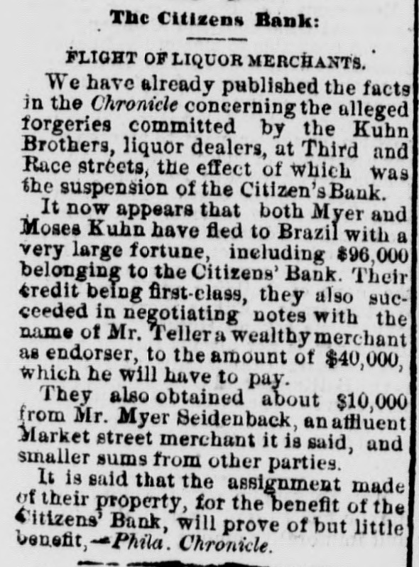 The Citizens Bank: FLIGHT OF LIQUOR MERCHANTS. We have already published the facts in the Chronicle concerning the alleged forgeries committed by the Kuhn Brothers, liquor dealers, at Third and Race streets, the effect of which was the suspension of the Citizen's Bank. It now appears that both Myer and Moses Kuhn have fled to Brazil with a very large fortune, including $96,000 belonging to the Citizens' Bank. Their credit being first-class, they also succeeded in negotiating notes with the name of Mr. Tellera wealthy merchant as endorser, to the amount of $40,000, which he will have to pay. They also obtained about $10,000 from Mr. Myer Seidenback, an affluent Market street merchant it is said, and smaller sums from other parties. It is said that the assignment made of their property, for the benefit of the Citizens' Bank, will prove of but little benefit, - Phila. Chronicle.
