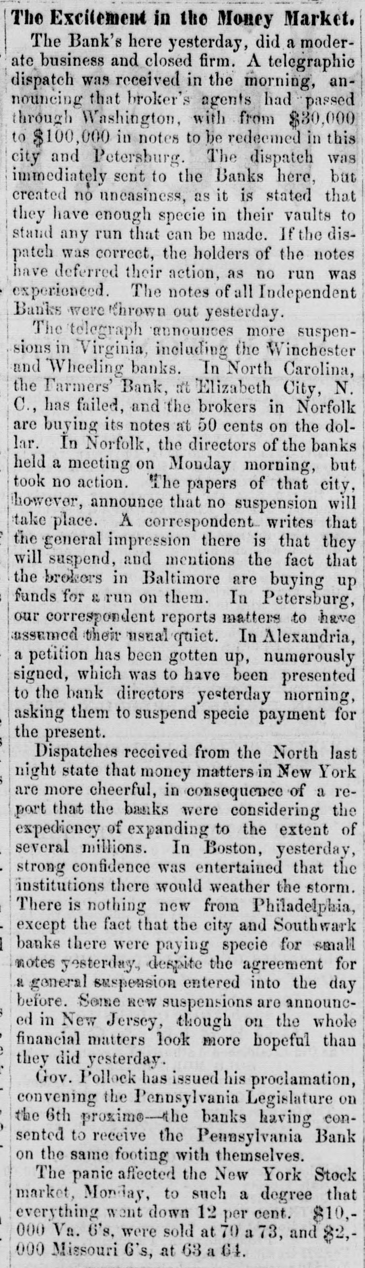 The Excitement in the Money Market. The Bank's here yesterday, did a moderate business and closed firm. A telegraphic dispatch was received in the morning, announcing that broker's agents had passed through Washington, with from $30,000 to $100,000 in notes to be redeemed in this city and Petersburg. The dispatch was immediately sent to the Banks here, but created no uncasiness, as it is stated that they have enough specie in their vaults to stand any run that can be made. If the dispatch was correct, the holders of the notes have deferred their action, as no run was experienced. The notes of all Independent Banks were thrown out yesterday. The telegraph unnounces more suspensions in Virginia, including the Winchester and Wheeling banks. In North Carolina, the Farmers' Bank, at Elizabeth City, N. C., has failed, and the brokers in Norfolk are buying its notes at 50 cents on the dollar. In Norfolk, the directors of the banks held a meeting on Monday morning, but took no action. The papers of that city, however, announce that no suspension will take place. A correspondent writes that the general impression there is that they will suspend, and mentions the fact that the brokers in Baltimore are buying up funds for & run on them. In Petersburg, our correspondent reports matters to have assumed their usual quiet. In Alexandria, a petition has been gotten up, numerously signed, which was to have been presented to the bank directors yesterday morning, asking them to suspend specie payment for the present. Dispatches received from the North last night state that money matters in New York are more cheerful, in consequence of a report that the banks were considering the expediency of expanding to the extent of several millions. In Boston, yesterday, strong confidence was entertained that the institutions there would weather the storm. There is nothing new from Philadelphia, except the fact that the city and Southwark banks there were paying specie for small notes yesterday, despite the agreement for & general suspension entered into the day before. Some RCW suspensions are announced in New Jersey, though on the whole financial matters look more hopeful than they did yesterday. Gov. Pollock has issued his proclamation, convening the Pennsylvania Legislature on the 6th proximo-the banks having consented to receive the Pennsylvania Bank on the same footing with themselves. The panic affected the New York Stock market, Monday, to such a degree that everything went down 12 per cent. $10,000 Va. 6's, were sold at 70 a 73, and 82,000 Missouri 6's, at 63 a 64.