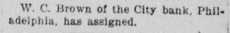W. C. Brown of the City bank, Philadelphia, has assigned.