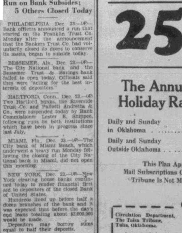 Run on Bank Subsides: 5 Others Closed Today PHILADELPHIA Dec officers run that Bank started on the Franklin Trust Co. Monday after the that the Bankers Trust Co. had voluntarily closed its doors to conserve its assets, began to subside today. City bank and the The Trust Savings failed to open today Officials said they were for the best interests of depositors. Two banks. the Riverside Trust and Pallotti Andretta & were today by Bank Co., following runs on both institutions which have been in progress since last Fla Daily and Sunday bank of Miami which City Outside Oklahoma run Monday the closing of the City Na lowing tional bank in Miami, did not open this morning NEW YORK York house banks today to render financial to of the closed Bank aid of United lined up before half Hundreds dozen of the bank and expected that before the day's end loans about $3,000,000 Circulation Department. would be made The Tulsa Tribune, may borrow equal to half their