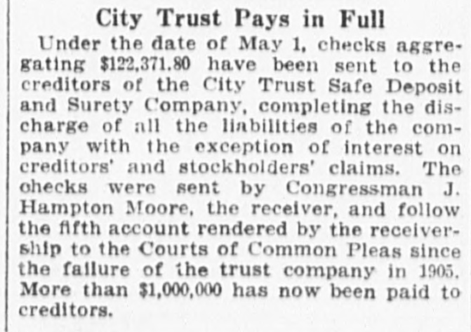 City Trust Pays in Full Under the date of May 1, checks aggregating $122,371.80 have been sent to the creditors of the City Trust Safe Deposit and Surety Company, completing the discharge of all the liabilities of the company with the exception of interest on creditors' and stockholders' claims. The checks were sent by Congressman J. Hampton Moore, the receiver, and follow the fifth account rendered by the receivership to the Courts of Common Pleas since the failure of the trust company in 1905. More than $1,000,000 has now been paid to creditors.