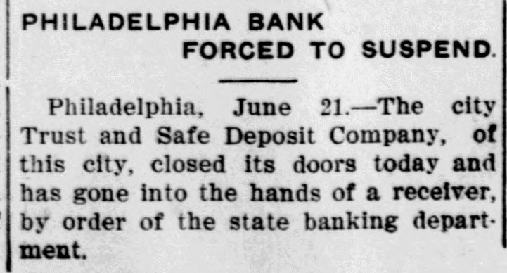 PHILADELPHIA BANK FORCED TO SUSPEND. Philadelphia, June 21.-The city Trust and Safe Deposit Company, of this city, closed its doors today and has gone into the hands of a receiver, by order of the state banking department.