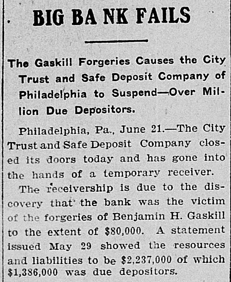 BIG BA NK FAILS The Gaskill Forgeries Causes the City Trust and Safe Deposit Company of Philadelphia to Suspend-Over Million Due Depositors. Philadelphia, Pa., June 21.-The City Trust and Safe Deposit Company closed its doors today and has gone into the hands of a temporary receiver. The receivership is due to the discovery that the bank was the victim of the forgeries of Benjamin H. Gaskill to the extent of $80,000. A statement issued May 29 showed the resources and liabilities to be $2,237,000 of which $1,386,000 was due depositors.